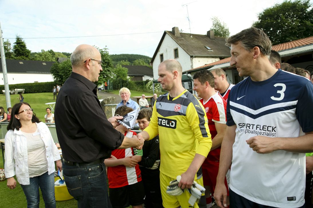 Im Mittelpunkt der Sportwerbeveranstaltung des MSV stand am Freitag die 25. Auflage des Topspiels im Mehlental: Die „Kicker gegen Krebs“ und die Traditionsmannschaft von Fortuna Düsseldorf lieferten sich vor 200 Zuschauern ein ansehnliches Spielchen, in dem das fußballerische Vermögen von Eintracht-Trier-Legende Rudi Thömmes, weiteren früheren, regionalen klasse Kickern wie Uwe Heinsdorf, Werner Heinzen, Stefan Fleck & Co. auf der einen Seite und langjährigen Ex-Bundesligaspielern auf der anderen Seite deutlich wurde. Fortuna-Teammanager Mehdi Schröder hatte mit Gerd Zewe und Egon Köhnen sogar zwei jener Düsseldorfer Kämpen dabei, die 1979 das legendäre Endspiel 1979 im Europapokal der Pokalsieger gegen den FC Barcelona (3:4 nach Verlängerung) bestritten und auch maßgeblich am DFB-Pokal-Gewinn 1979 und ´80 beteiligt waren. Durch zwei Treffer von Rudi Thömmes führten die „Kicker gegen Krebs“ zwar kurz nach der Halbzeit noch mit 2:0, dann legte die Fortuna aber los, schoss fünf Tore in Folge. Am Sieg von Zewe & Co. konnte auch der dritte Treffer von Thömmes nichts mehr ändern. Viel wichtiger als das 5:3 war aber auch den Fortunen, dass sie ihren Teil für einen möglichst hohen Spendenerlös zu Gunsten der Krebsgesellschaft Rheinland-Pfalz und hier konkret für das Beratungsangebot in der Prümer Außenstelle beitragen konnten: 1.600 Euro übergaben Vertreter von Fortuna und der Kicker gegen Krebs kurz nach dem Abpfiff von Schiedsrichter Mario Schmidt (Daun) an Kornelia Huber von der Krebsgesellschaft. „Der Platz war super, das Ambiente sehr angenehm und der Gegner äußerst stark“, zeigte sich auch Fortuna-Legende Zewe äußerst angetan vom Gastspiel auf der Sportanlage an der Mehlener Straße in Gondenbrett.