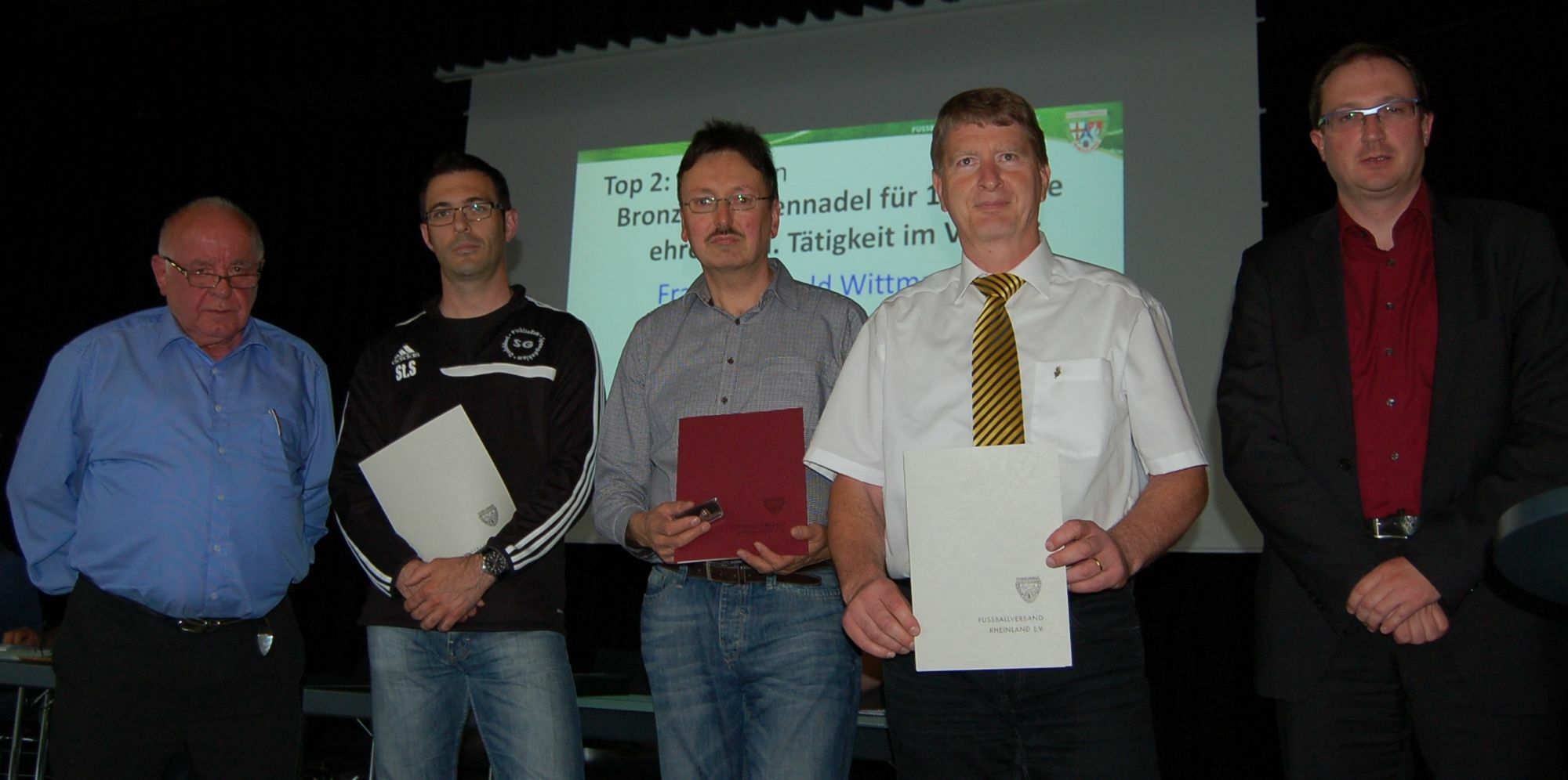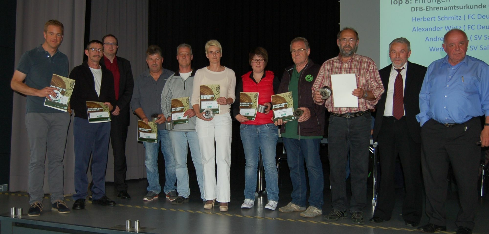 „Der Deutsche Fußball-Bund ist mehr als nur die Nationalmannschaft. Ihm ist das Wirken an der Basis sehr wichtig“, hatte zuvor Jörg Ehlen betont. Der Wittlicher ist Landesehrenamtsbeauftragter im Fußballverband Rheinland und arbeitet so auch eng mit den Ehrenamtsbeauftragten in den neun Kreisen zusammen – wie etwa in der Eifel mit Helmut Schmitt. Beide riefen die Klubgesandten in Schönecken dazu auf, Ehrenamtler aus den eigenen Reihen für diverse Auszeichnungen vorzuschlagen. „Das müssen nicht immer jene an der vordersten Front sein, sondern auch mal die stillen Helfer im Hintergrund – wie etwa die Frau, die sonntags beim Heimspiel immer den Kaffee- und Kuchenstand betreut“, so Ehlen. Für mindestens zehn (bei Frauen) beziehungsweise 15 Jahre (Männer) ehrenamtliche Tätigkeit im Verein hat der Fußballkreis Eifel diesmal folgende Personen mit einer DFB-Ehrenamtsurkunde und – uhr bedacht: Angela und Bernhard Dax (beide Freizeitmannschaft Schutz), Ariane Last (SV Waxweiler), Herbert Schmitz und Alexander Wirtz (beide FC Deudesfeld), Andreas Dietz und Werner Eul (beide SV Salm) sowie Reinhold Pfeiffer und Heinz Düx, die beide dem SC Rengen angehören. Amtierender Ehrenamtspreisträger für „herausragende Leistungen in den vergangenen drei Jahren“, so der offizielle Wortlaut, ist Bernd Umbach vom SV Mehren. Bei den „Fußballhelden“ werden zudem junge Ehrenamtler noch einmal fokussiert. Aktueller Preisträger ist hier Jonas Backes von der DJK Auw. Mit dem Ehrenbrief des Fußballverbandes Rheinland wurden Stefan Salzburger und Otmar Kaufmann für ihr zehnjähriges Wirken, mit der Bronzenen Ehrennadel für 15 Jahre im Verein Franz Reinhold Wittmar (alle vom SV Pickließem) ausgezeichnet.