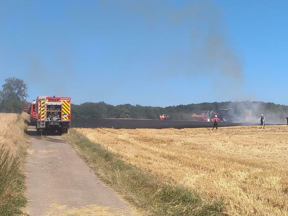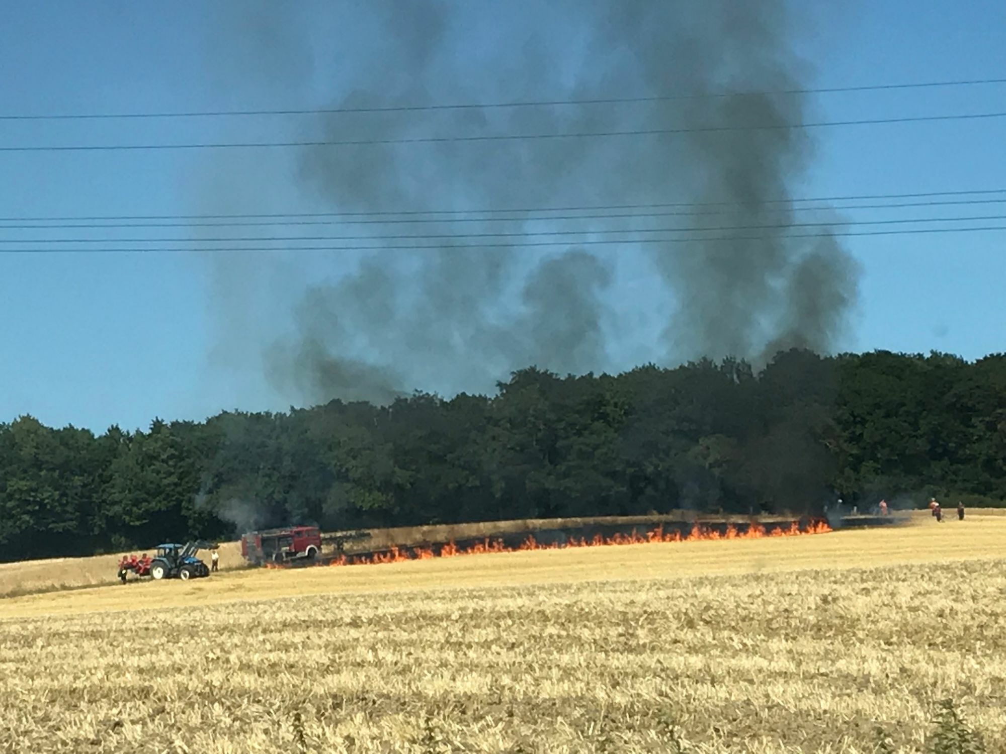Die umliegenden Feuerwehren konnten den in Flammen geratenen Mähdrescher sowie die ca. 1500 Quadratmeter große, ebenfalls in Brand geratene Fläche schnell unter Kontrolle bringen und letztlich löschen.