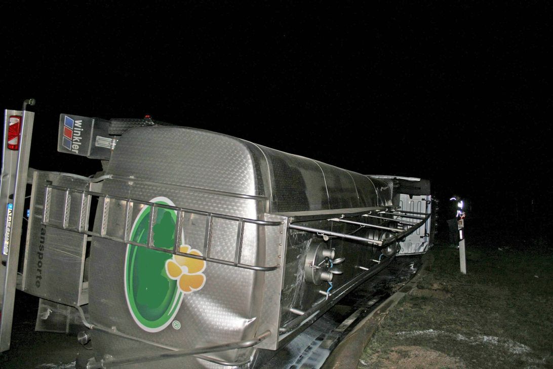 Zu einem Milchtankzug-Unfall kam es am gestrigen Abend gegen 19.30 Uhr auf dem Kreisel B51/A60-Zubringer an der Anschlussstelle Prüm. Ein beladenes Milchsammelfahrzeug mit KLE-Kennzeichen ist im Kreisel aus bisher noch ungeklärten Gründen auf dem Weg zur Arla umgekippt. Nach Angaben der Polizei wurde der Fahrer dabei leicht verletzt. Da der Tank beschädigt wurde, lief die Milch über die gesamte Fahrbahn, so dass wegen des Fettgehalts eine spiegelglatte Teerdecke entstand. Die Höhe des Sachschadens und die Unfallursache stehen noch nicht fest.