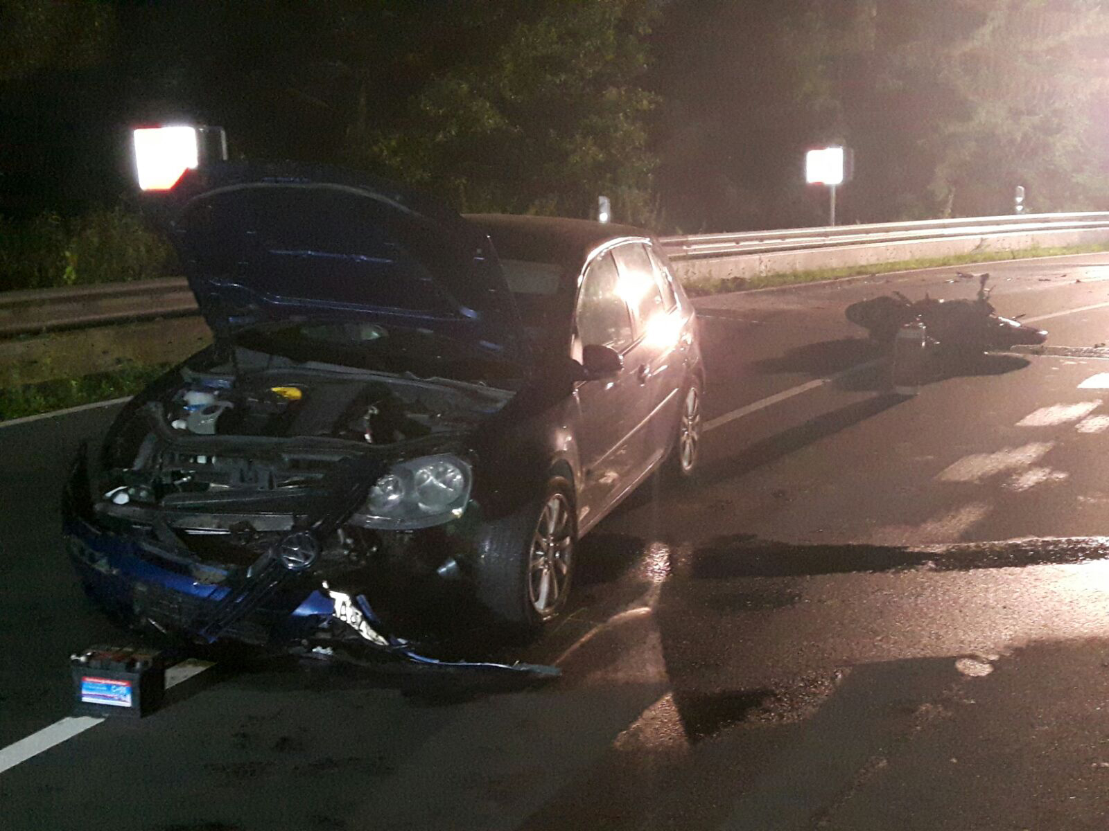 Zu einem schweren Verkehrsunfall kam es am Mittwochabend gegen 21.35 Uhr auf der B 50 zwischen Beilingen und Dudeldorf. Aus bislang unbekannter Ursache waren dort ein PKW und ein Motorrad frontal zusammengestoßen. Dabei  wurde der Motorradfahrer schwer verletzt.  Die B 50 war für die Dauer der Rettungs- und Bergungsarbeiten voll gesperrt. An den beiden Fahrzeugen entstand erheblicher Sachschaden. Im Einsatz war die Polizeiinspektion Bitburg, die Feuerwehr aus Dudeldorf sowie das DRK aus Speicher und Bitburg mit Notarzt.  Foto: Siko