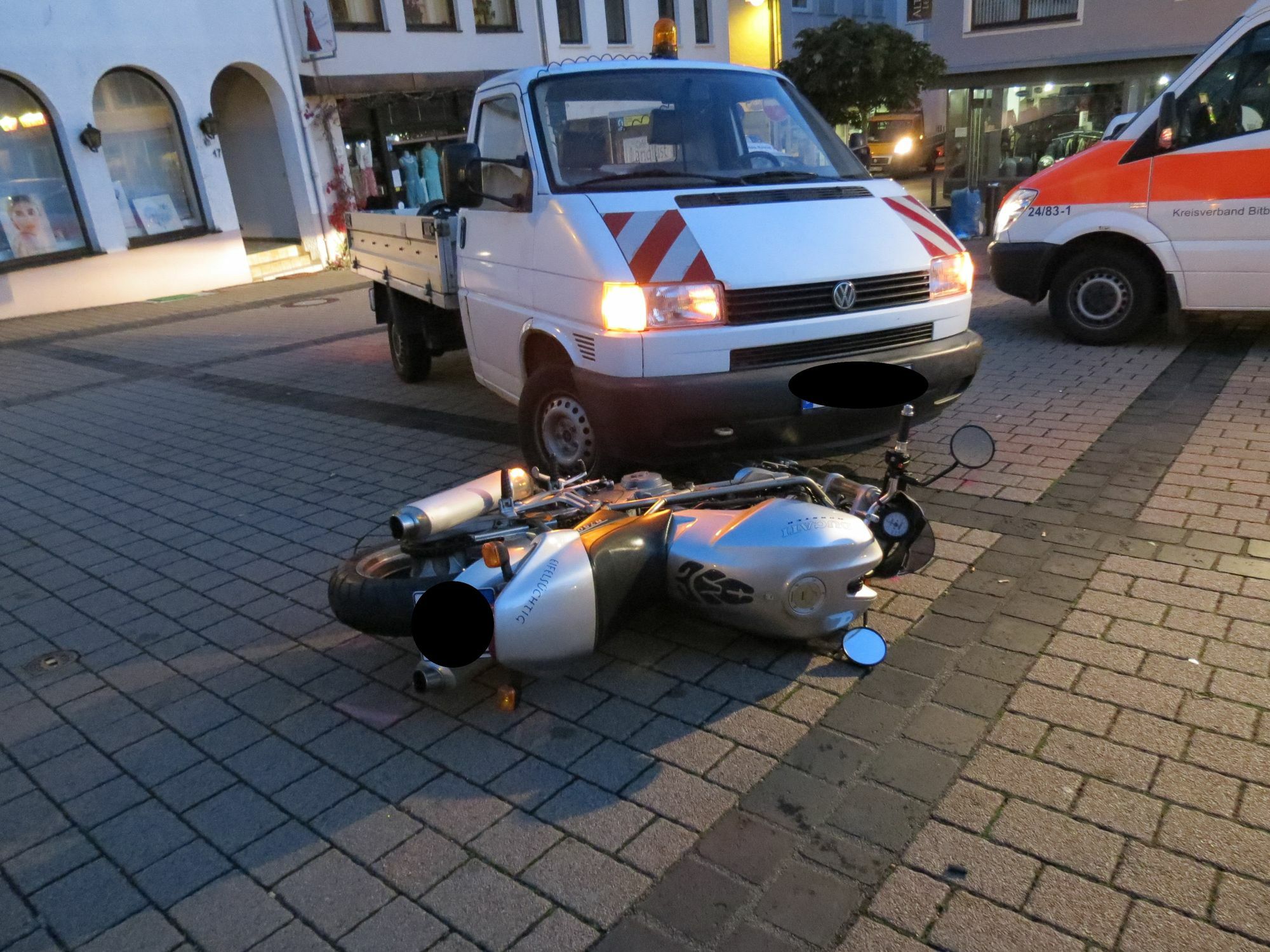 Eine Motorradfahrerin wurde bei einem Unfall am Sonntag auf dem Altenmarkt in Prüm schwer verletzt. Sie wurde von einem Fahrzeug der Stadt angefahren. Der Fahrer war unterwegs, um Verkehrszeichen einzusammeln. Als er von der Bachstraße in den Altenmarkt einbog, übersah er die Motorradfahrerin, die von rechts kam und Vorfahrt hatte. Bei dem  Sturz verletzte sich die Motorradfahrerin schwer. Gegen den Fahrzeugführer wurde ein Strafverfahren wegen fahrlässiger Körperverletzung eingeleitet. Foto: Polizei