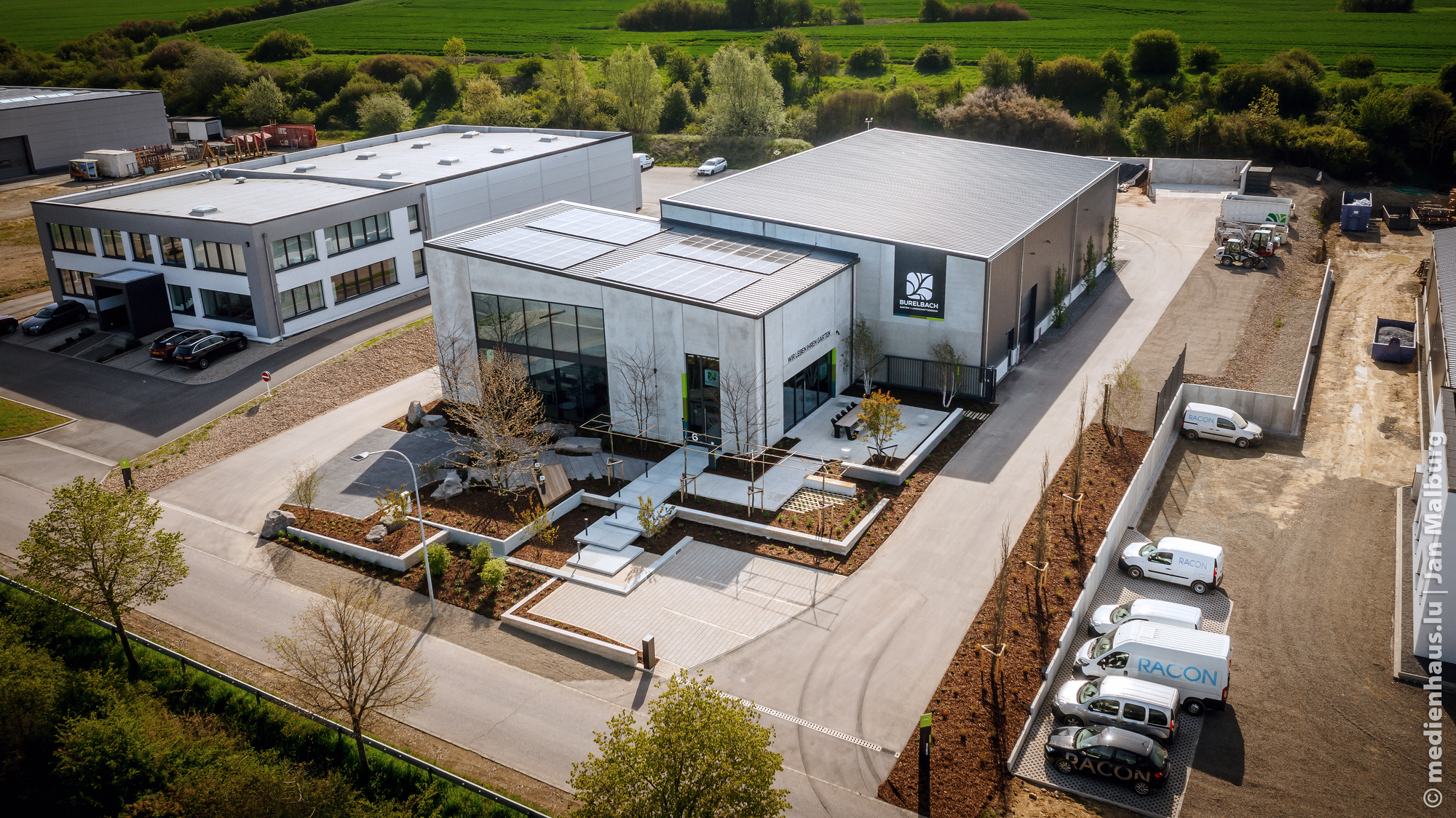 Die Innen-, aber auch die Außenanlagen des neuen Firmengebäudes stehen unter dem Aspekt der Nachhaltigkeit. "Die gesamte Beleuchtung, sowohl Indoor als auch Outdoor, sind mit LED Lampen ausgestattet. Die Gebäudeeinheiten werden mit Wärmepumpe beheizt", so Geschäftsführer Stefan Burelbach. Das zur Bewässerung der Anlage benötigte Oberflächen- und Quellwasser wird mit einer 15.000-Liter-Zisterne gesammelt und über eine automatisierte Bewässerungsanlage genutzt.