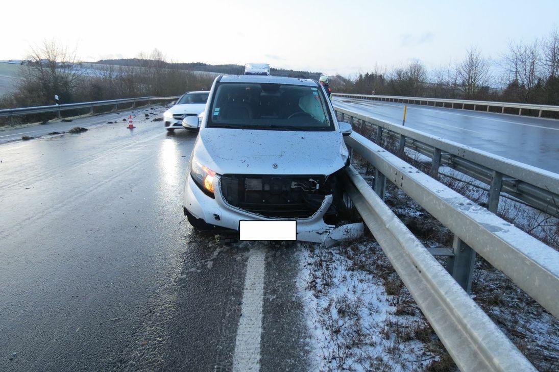 Am Mittwoch, 12. Februar, fuhr eine Reisegruppe gegen 17.30 Uhr, mit insgesamt 16 Personen in zwei Kleinbussen, die A60 aus Richtung Belgien kommend in Fahrtrichtung Bitburg. Kurz vor der Abfahrt Waxweiler kam der 24-jährige koreanische Fahrzeugführer des vorausfahrenden Kleinbuses aufgrund winterglatter Fahrbahn und Sommerreifen ins Rutschen und prallt in die rechtseitige Leitplanke.