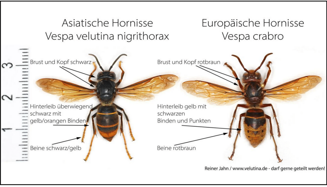 Von der heimischen Hornisse, die in weiten Teilen Deutschlands als gefährdet gilt, unterscheidet sie sich durch einen dunkleren Körper und die typischen gelben Füße.