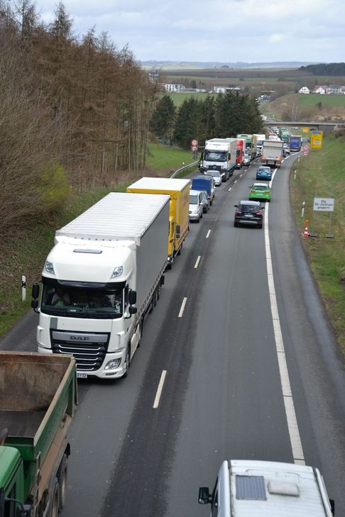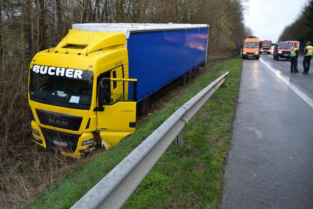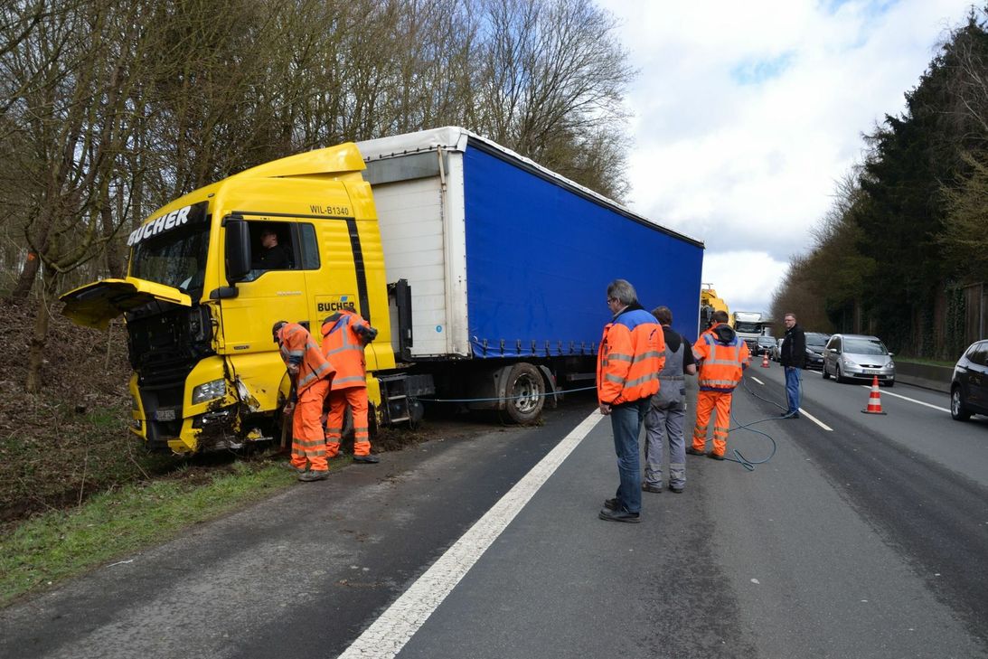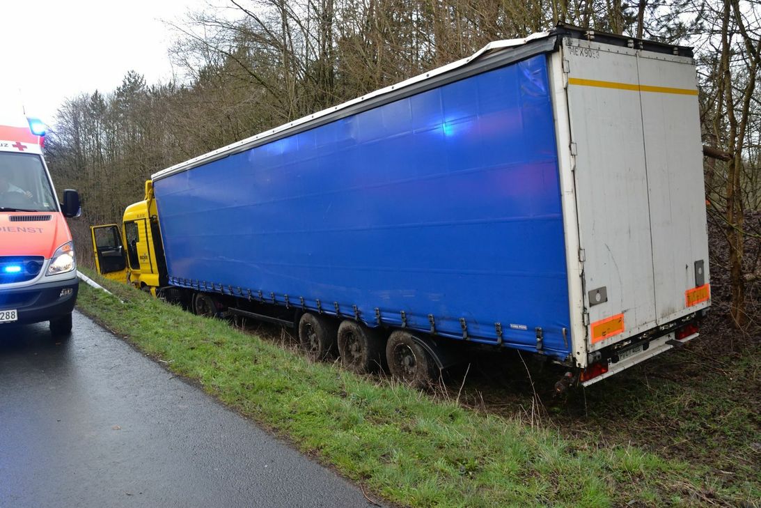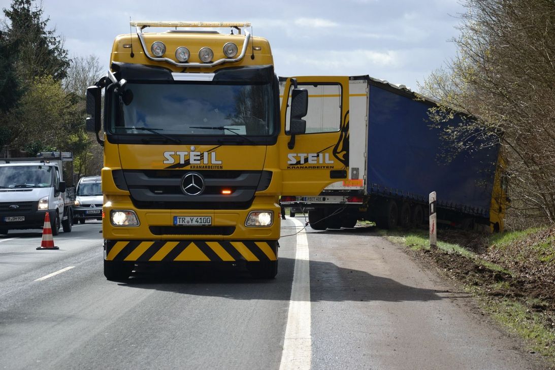 Der Sattelzug war kurz nach 8 Uhr in Fahrtrichtung Trier Höhe Kolmeshöhe nach rechts von der Straße abgekommen. Laut Polizei Bitburg gab der verletzte Fahrer an, ihm sei plötzlich übel geworden. Hierdurch verlor er die Kontrolle über den Sattelzug und fuhr zunächst rund 75 Meter an der Böschung entlang, bevor sein Sattelzug etwa in Höhe der Abfahrt nach Luxemburg im Straßengraben zum Stehen kam. Die sofort zum Unfallort alarmierten Feuerwehren Stadtmitte Bitburg, Mötsch und Masholder sicherten im Anschluss die Unfallstelle weiträumig ab. Im Bereich der Unfallstelle kam es durch die Unfallaufnahme kurzfristig zu Behinderungen. Über die Schadenshöhe konnte die Polizei noch keine Angaben machen. Der Verkehr musste während der Bergungs- und Reinigungsarbeiten einseitig mit Ampelregelung gesperrt werden. Hierdurch kam es in beide Fahrtrichtungen zu kilometerlangen Staus. Die B51 wird voraussichtlich ab circa 13 Uhr wieder in beide Richtungen störungsfrei befahrbar sein. Fotos: Siko