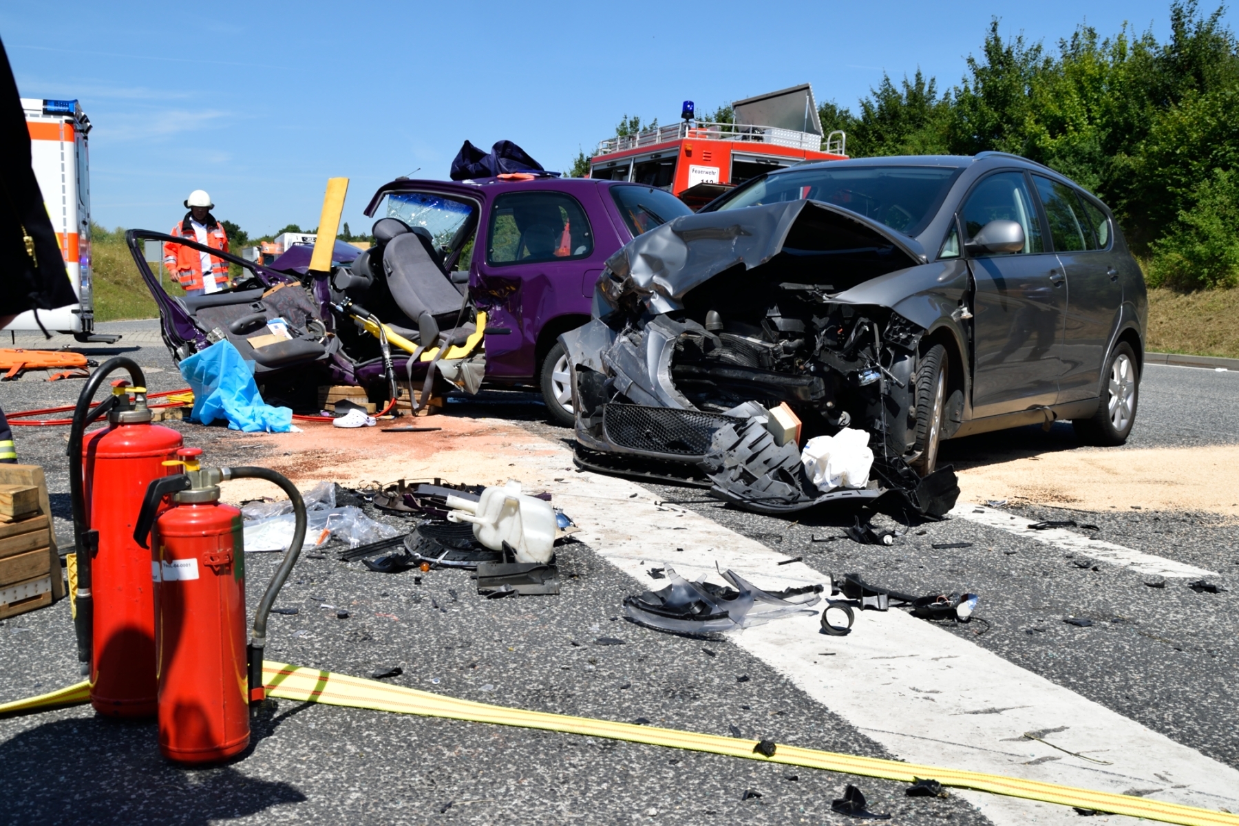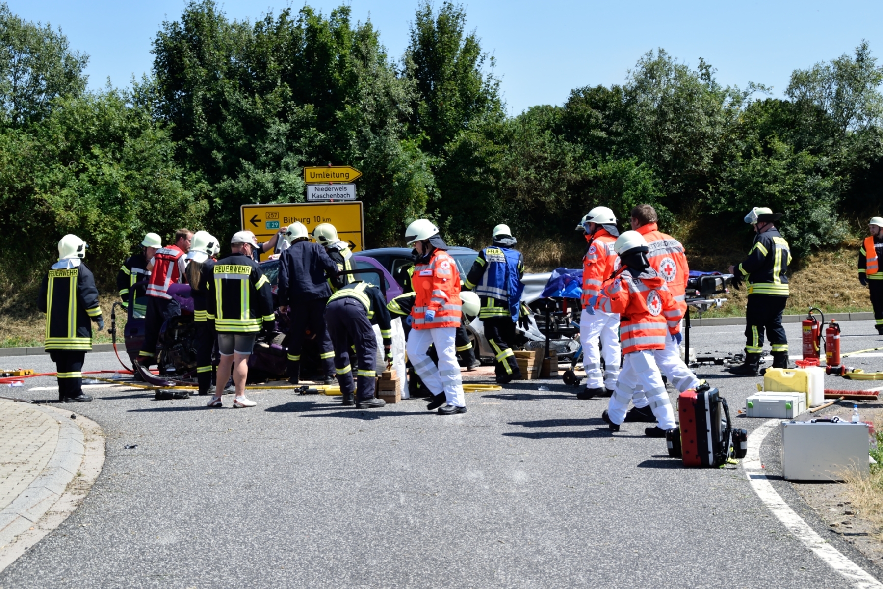 Die Fahrerin eines Seat Altea war im Kreuzungsbereich der B257 bei Wolsfeld frontal mit einem aus Bitburg entgegenkommenden PKW zusammengestoßen. Nach Polizeiangaben hatte die Fahrerin des Seat den PKW Nissan Micra übersehen und die Vorfahrt missachtet. Die beiden PKW prallten im Kreuzungsbereich mit voller Wucht zusammen. Die Fahrerin des kleinen Nissan Micra wurde hierbei nach Angaben des Einsatzleiters der VG Süd-Eifel, Richard Wirtz, eingeklemmt. Sie musste mit schwerem Gerät und Spreizwerkzeugen aus ihrem total beschädigten PKW gerettet werden. „Wir brauchten rund 20 Minuten, um die Frau zu befreien“, so Richard Wirtz weiter. Die Fahrerin des Seat musste ebenfalls mit schweren Verletzungen in ein Krankenhaus eingeliefert werden. Die B257 blieb während der Unfallaufnahme und den Rettungsarbeiten für den gesamt Verkehr voll gesperrt. An beiden PKW entstand Totalschaden. Im Einsatz waren nben der Polizei Bitburg die Feuerwehren aus Alsdorf, Niederweis und Irrel zusammen mit der Wehrleitung VG Süd-Eifel, dem DRK, einem Notarzt aus Bitburg und dem Air Rescue aus Luxemburg. Fotos: Siko