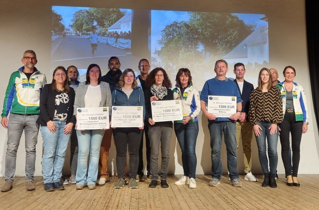 Beim Jubiläumslauf des 30. Bitburger Stadtlaufes im September 2024 konnten die Eifelläufer einen großen Erfolg feiern. Dank des Engagements der Teilnehmer, Helfer und Sponsoren war es möglich, eine Spendensumme von insgesamt 6.000 Euro zu erzielen. Diese wurde feierlich an vier Bitburger Institutionen übergeben. Jeweils 1.500 Euro erhielten: