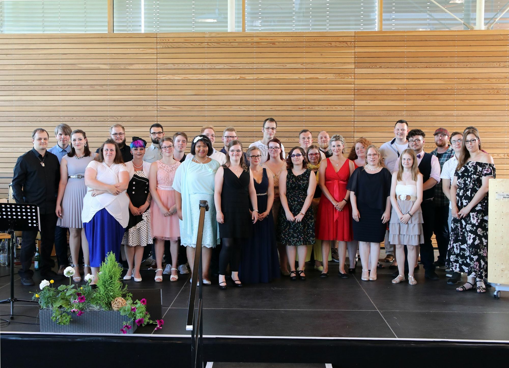 46 Absolventinnen und Absolventen der Winter- und Sommerprüfung 2019 wurden am vergangenen Donnerstag, 27. Juni, im Rahmen einer stimmungsvollen Feierstunde verabschiedet. Neben Eltern, Angehörigen, Mitarbeitenden und Teilnehmenden des Euro-BBW waren als weitere Gäste der Bürgermeister der Stadt Bitburg, Joachim Kandels, sowie Vertreter der Arbeitsagentur Trier, der luxemburgischen Arbeitsverwaltung ADEM, der IHK Trier und sonstiger Partner aus der Wirtschaft sowie dem Sozial- und Gesundheitswesen vor Ort. Manuel Gonzalez, Vorstand des DRK-Landesverbands Rheinland-Pfalz, lobte in seiner Begrüßung die guten Leistungen der frischgebackenen Absolventinnen und Absolventen und sprach den Mitarbeitenden des Euro-BBW gegenüber seine Wertschätzung aus. Er zeigte sich begeistert, dass fast Dreiviertel der Absolventen bereits in Arbeit sind oder konkrete Zusagen für einen Arbeitsplatz haben. Anschließend ließ Ronald Fröhling, stellvertretender Euro-BBW-Leiter und Bereichsleiter Beratung und Begleitung, die Ausbildungszeit mit einem Perspektivenwechsel ironisch Revue passieren. Mit humorvollen und persönlichen Worten führte Euro-BBW-Leiterin Anita Sonndag durch die Zeremonie der Zeugnisübergaben und sorgte für eine heitere Stimmung. Besonders ausgezeichnet wurden drei Schüler durch Schulleiter Prof. Dr. Berthold Hornetz, die Durchschnittsnoten zwischen 1,0 und 1,3 erzielt haben. Umrahmt wurde die Feierstunde mit speziell ausgesuchten und gut zum Anlass passenden musikalischen Beiträgen der Hausband "PSYKOHL". Die Feier schloss mit einem geselligen Beisammensein mit Sommercocktails und kulinarischen Leckerbissen in der Mensa des Euro-BBW ab, das insbesondere auch für sehr persönliche Verabschiedungen untereinander, aber auch mit Ausbildern, Lehrern und den weiteren Bezugspersonen im Euro-BBW intensiv genutzt wurde. Ebenfalls stark zum Einsatz kam die speziell für diesen Anlass gemietete Photobox, die die Absolventinnen und Absolventen eifrig für individuelle Erinnerungsfotos an ihre Zeit im Euro-BBW nutzten.