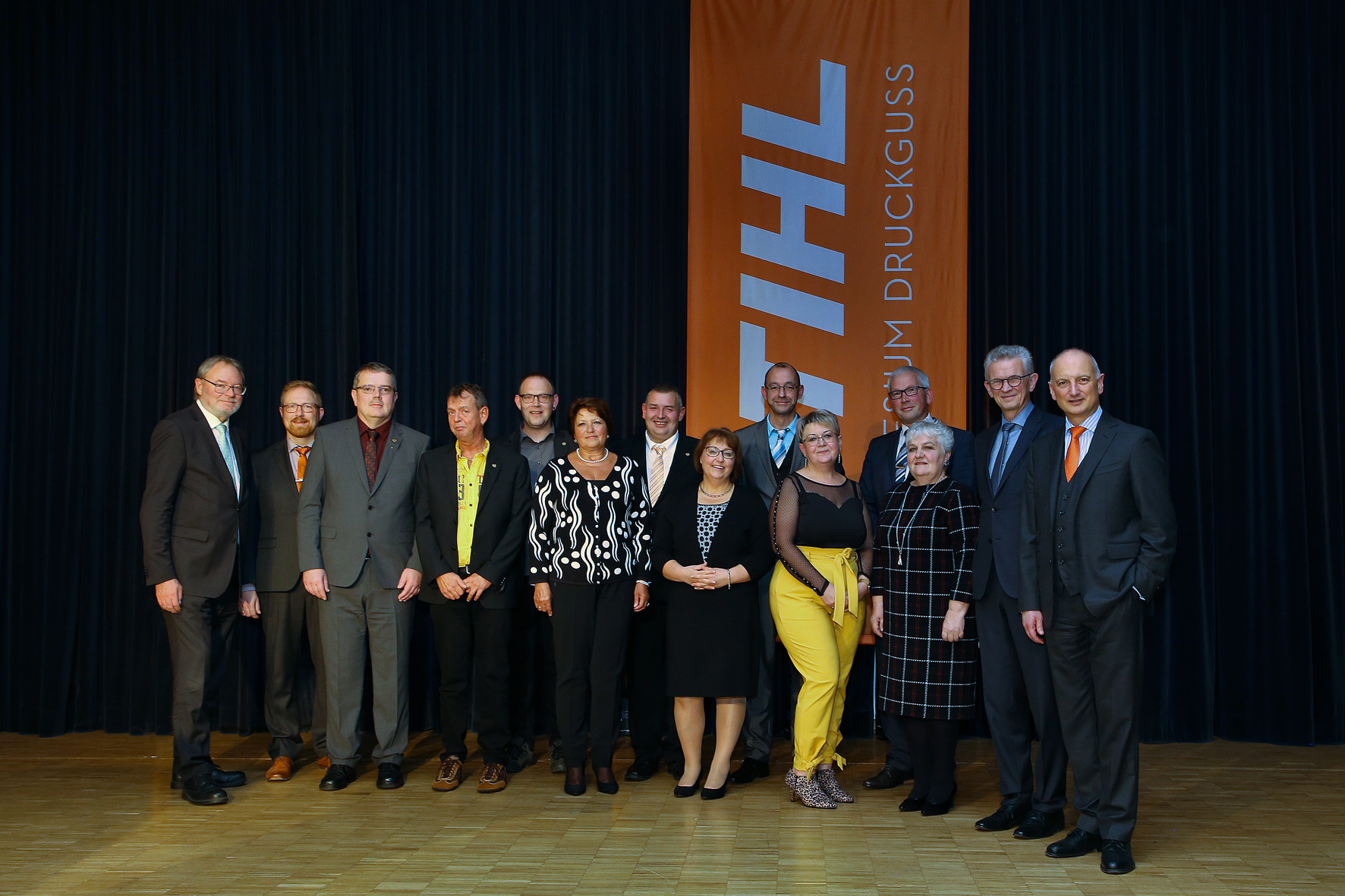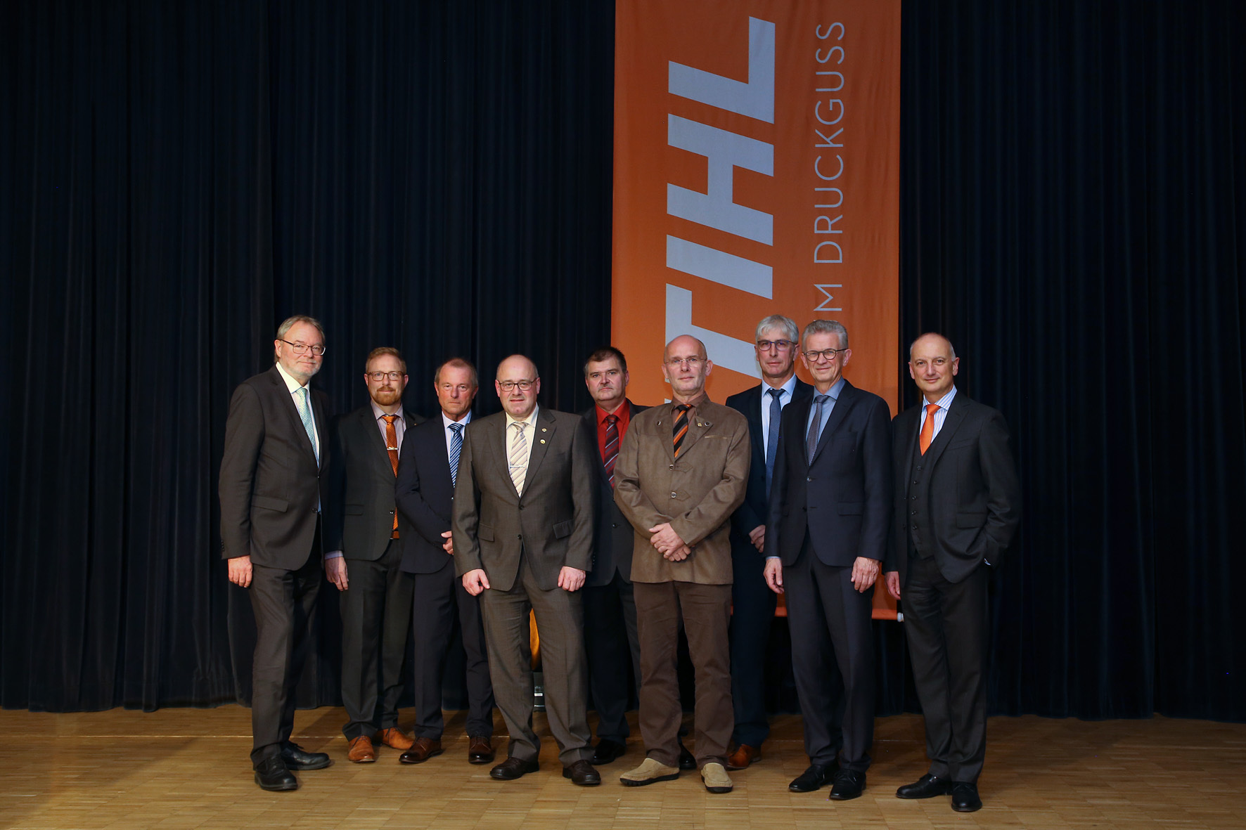 Im Beisein des Ehrenvorsitzenden des Beirates, Hans Peter Stihl, dem Beiratsvorsitzenden Dr. Nikolas Stihl, dem Vorstandsvorsitzenden, Dr. Bertram Kandziora, sowie dem Vorstandsmitglied Personal, Dr. Michael Prochaska, und zahlreicher Gäste wurden 5 Mitarbeiter für 40 Jahre und 10 Mitarbeiter für 25 Jahre Treue zum Unternehmen gewürdigt.