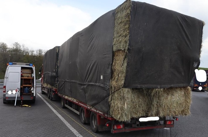 Ein niederländischer Heu-Transporter überschritt die zulässigen Maße mit einer Länge von 19,05m und einer Höhe von 4,20m. Nach Kürzung der Deichsel und Reduzierung der Ladung durfte der Lkw seine Fahrt fortsetzen. Ein Abfalltransporter und ein überladener Langholztransport mit Fichtenholz, der auf dem Weg zu einem Sägewerk war, wurden ebenfalls gestoppt. Bei letzterem wurde ein Gewicht von über 52,5 Tonnen festgestellt. Nach Entladung eines Teils der Ladung konnte die Weiterfahrt fortgesetzt werden.