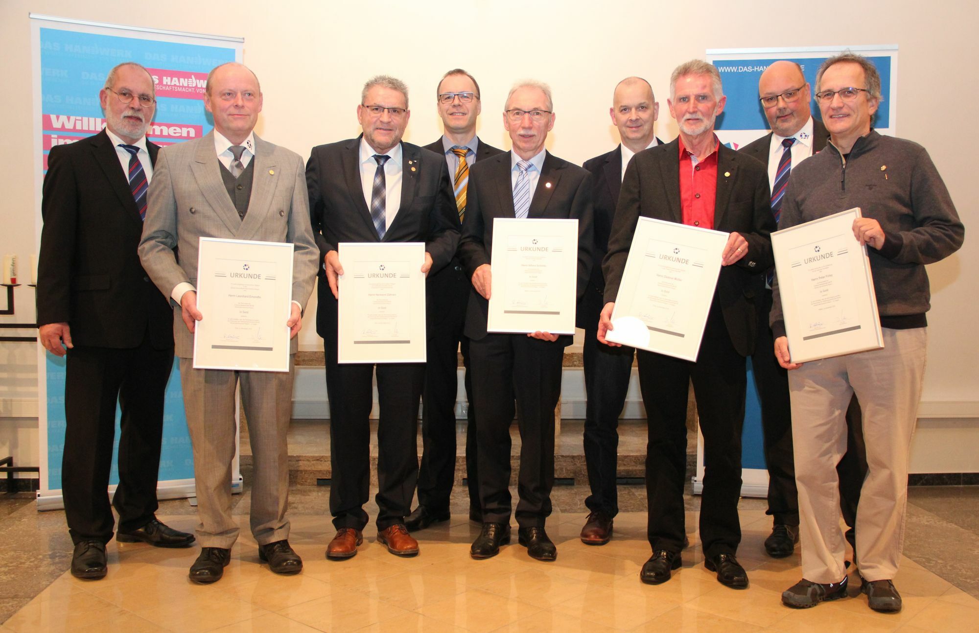 Es ist bereits Tradition bei der Kreishandwerkerschaft Mosel-Eifel-HunsrückRegion (MEHR), langjährig ehrenamtlich Engagierte mit der Goldenen Ehrennadel der Kreishandwerkerschaft - der höchsten Auszeichnung der Organisation - zu ehren. Vorsitzender Kreishandwerksmeister Raimund Licht würdigte nun gemeinsam mit seinen beiden Kreishandwerksmeisterkollegen Bernd Elsen und Hermann Waldorf und dem Geschäftsführer der Kreishandwerkerschaft MEHR, Dirk Kleis, das ehrenamtliche Engagement von sechs Kollegen. Sie alle haben sich in besonderem Maße für ihren Berufsstand, ihre Innung und für das Handwerk insgesamt verdient gemacht und engagieren sich teilweise bis heute im Ehrenamt. Zur Überreichung hatte die Kreishandwerkerschaft in die Kapelle des ehemaligen Konvikt in Prüm eingeladen, wo zusammen mit der Verleihung der Goldenen Meisterbriefe viele Gäste aus Handwerk und Politik der Feierlichkeit beiwohnten.