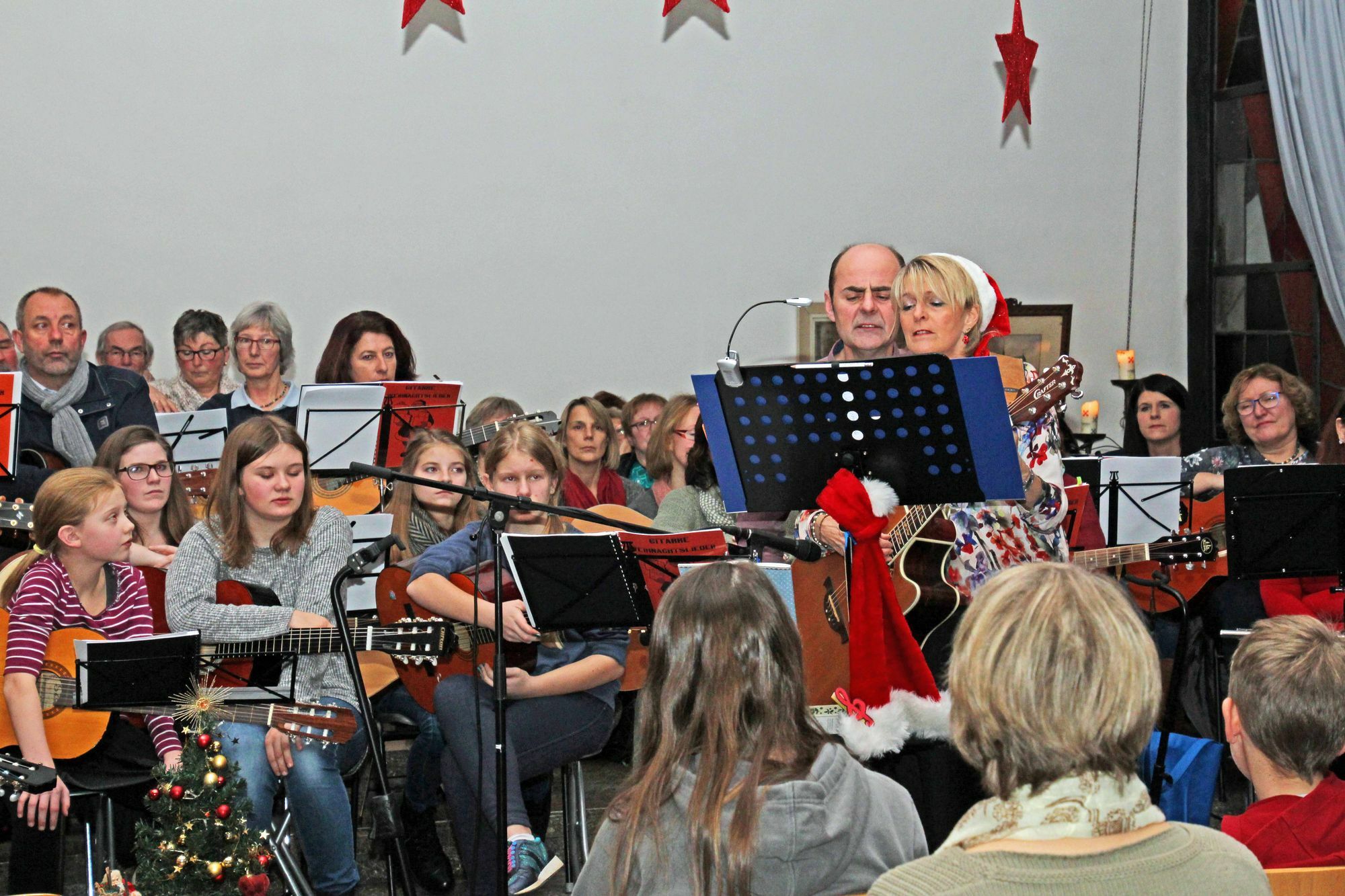 Auch diesmal waren Eingang Foyer und Saal wieder mit viel Liebe, Einfallsreichtum und Aufwand weihnachtlich geschmückt. So war die Kapelle des Konviktes in Prüm nicht nur eine Augenweide, sondern auch eine wunderbare Einstimmung auf einen gelungenen Abend. Nach einem musikalischen Einstieg begrüßten Bürgermeister Aloysius Söhngen in seiner Funktion als Vorsitzender der VHS Prüm das Publikum und dankte Therese Müller für die Organisation und Durchführung dieses Abends, überreichte einen Blumenstrauß und wünschte der Veranstaltung viel Erfolg. 100 Gitarrenspieler und eine riesige Sängerschar Therese Müller führte die über 100 Gitarrenspieler und eine riesige Sängerschar ohne jegliche Probe mit großem Geschick musikalisch zusammen. In dem von den Gitarristen und dem Publikum getragenen Konzert wurden alte und neue Weihnachtslieder dargeboten, und selbst bei Kanons machten alle begeistert mit. Auch bekannte Ohrwürmer waren wieder dabei. Zu den Höhepunkten des Abends gehörten auch einige Gesangsduette Therese Müllers mit ihrem Mann Stefan. Insgesamt gelang so ein Abend voller bewegender, unterhaltsamer und mitreißender Elemente. Konzert berührt die Herzen der Gäste Das rund zwei Stunden dauernde Weihnachtssingen hat die Herzen der Gäste berührt und verging wie im Fluge. Zahlreiche Teilnehmer ließen den Abend im Foyer des Konviktes mit Tee, Kuchen und Plätzchen besinnlich und fröhlich ausklingen. Der Eintritt war frei. Die erzielten Spenden werden der Kinderkrebsstation Trier zugeführt. red