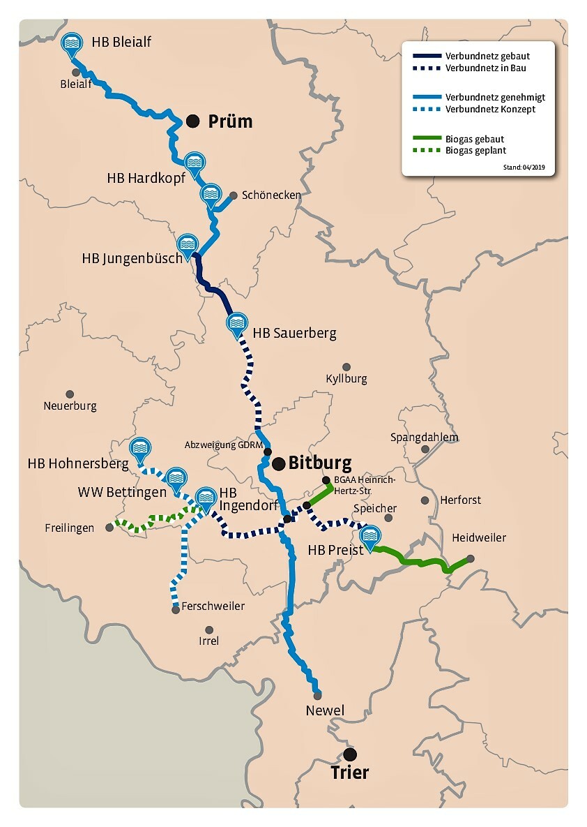 "Das Projekt umfasst nämlich zwei verschiedene, in Abschnitte eingeteilte Trassen: Die Nord-Süd-Achse verläuft von der nordrhein-westfälischen Grenze auf achtzig Kilometern bis nach Trier im Süden. "Hier verlegen die Projektpartner nach Bedarf Trinkwasser, Glasfaser-, Erdgas- und Biogasleitungen." Die Ost-West Trasse verläuft auf rund 45 Kilometern südlich von Bitburg durch die Verbandsgemeinden Wittlich-Land, Speicher, Trier-Land, Bitburger Land und Südeifel. "Sie verbindet insbesondere sieben vorhandene Biogasanlagen, deren Biogas zukünftig am Flugplatz Bitburg aufbereitet und in das Erdgasnetz eingespeist werden soll. Hier sind bislang etwa 15 Kilometer Trasse für Biogas und Breitbandversorgung verlegt", so Welsch.
