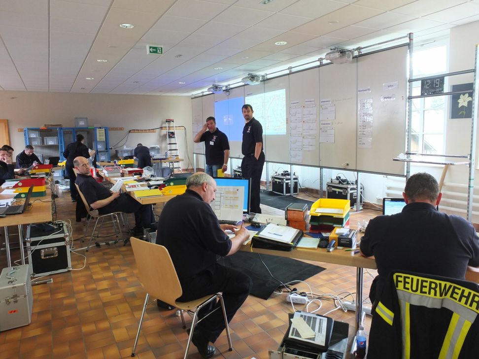 Seit mehreren Wochen herrscht trockenes und sehr warmes Wetter, es ist sehr windig und bedingt durch einen Sturm im Herbst liegen noch viele umgestürzte Bäume im Wald, die bisher noch nicht aufgearbeitet werden konnten. Ein Wanderer entdeckte am frühen Samstagmorgen im Wald bei Sankt Thomas einen größeren Brand.Da in dem Gebiet kein Handyempfang war musste der Wanderer ca. 2 Kilometer zurück laufen, um einen Notruf abzusetzen. Dies war die Ausgangslage für eine Übung der Feuerwehr Führungsstaffel der VG Bitburger Land und der Technischen Einsatzleitung des Eifelkreises, die sich die Übungsleitung der TEL, Franz-Josef Gasper, von der Feuerwehr Erdorf und Joachim Hönel von der Feuerwehr Alsdorf ausgedacht hatten. Es war die erste Übung in dieser Zusammensetzung und "es wurde ein Einsatz-Szenario angenommen, wie es jederzeit eintreten kann", so der stellvertretende Kreisfeuerwehrinspekteur (KFI) und Leiter der TEL, Willi Schlöder. Nach Eingang des Notrufes wurden die zuständigen Feuerwehr Einheiten durch die Leitstelle bei der Berufsfeuerwehr in Trier alarmiert. Nach einer ersten Lageerkundung wurde eine Wasserversorgung aus der Kyll aufgebaut und das Wasser musste über lange Wegstrecken zum Einsatzort transportiert werden. Ebenso kamen große Tanklöschfahrzeuge zum Einsatz. Durch den starken Wind war die Ausbreitung des Brandes jedoch schon weit fortgeschritten. Der Einsatzleiter Werner Irsch von der Feuerwehr Baustert und die inzwischen am Einsatzort arbeitende Führungsstaffel der VG Bitburger Land erkannten schnell, dass hier weitere Einsatzkräfte aus verschiedenen Richtungen das Feuer bekämpfen müssen. So wurden zahlreiche Kräfte über die Feuerwehreinsatzzentrale (FEZ) in Kyllburg und die Leitstelle Trier nachalarmiert. Der ebenfalls vor Ort anwesende stellvertretende Kreisfeuerwehrinspektor entschied eine Erhöhung der Alarmstufe, die Übernahme der Einsatzleitung sowie die Alarmierung der TEL des Eifelkreises. Diese fand sich im Gemeindehaus in Neuheilenbach ein, um dort die Arbeit aufzunehmen und die Führung vor Ort in allen Belangen zu unterstützen. Es mussten weitere Einsatzkräfte nachgefordert werden, Bereitstellungsräume eingerichtet werden, Evakuierungen eingeleitet, die Verpflegung der Einsatzkräfte organisiert, sowie Betriebsstoffe für Pumpen und Fahrzeuge vor Ort gebracht werden. Auch die medizinische Versorgung von verletzten Feuerwehrleuten musste sichergestellt werden. Zudem wurde die Warnung der Bevölkerung über das modulare Warnsystem (MoWaS) des Bundes für Bevölkerungsschutz und Katastrophenhilfe (BBK) geübt. Zu Beginn der Übung stellte sich heraus, dass das digitale Funknetz in Neuheilenbach nur mangelhaft funktioniert und man daher gezwungen war, auf die noch vorhandene analoge Funktechnik zurückzugreifen, um die Übung überhaupt weiterführen zu können. Nach sieben Stunden waren fiktiv insgesamt über 30 Feuerwehren mit 250 Personen und 50 Fahrzeugen aus dem Eifelkreis Bitburg-Prüm, dem Vulkaneifelkreis, sowie den Landkreisen Trier-Saarburg und Bernkastel-Wittlich im Einsatz. Ebenso waren Kräfte des DRK , des THW, der Polizei, der Bundeswehr und der Deutschen Bahn im Einsatz. Auch Mitarbeiter der Behörden wie z.B. der zuständigen Forstverwaltungen, der Verbandsgemeinde Bitburger Land und der Kreisverwaltung Bitburg-Prüm waren im Einsatz. Für die 36 tatsächlich eingesetzten Übungsteilnehmer der FEZ Kyllburg und der TEL, die zwischendurch auch noch andere Paralleleinsätze wie einen Verkehrsunfall oder eine Alarmierung verursacht durch eine Brandmeldeanlage abarbeiten mussten, hatte der DRK Ortsverein Südeifel die Verpflegung organisiert. Wichtige Erkenntnisse im Bereich Organisation, Personalverstärkungen, Materialergänzungen und der mangelhaften Abdeckung des digitalen Funknetzes konnten so gewonnen werden. Zeitnah werden die erkannten Schwachstellen bearbeitet und entsprechende Veränderungen und Aktualisierungen erfolgen, so Joachim Hönel von der TEL. Foto: TEL