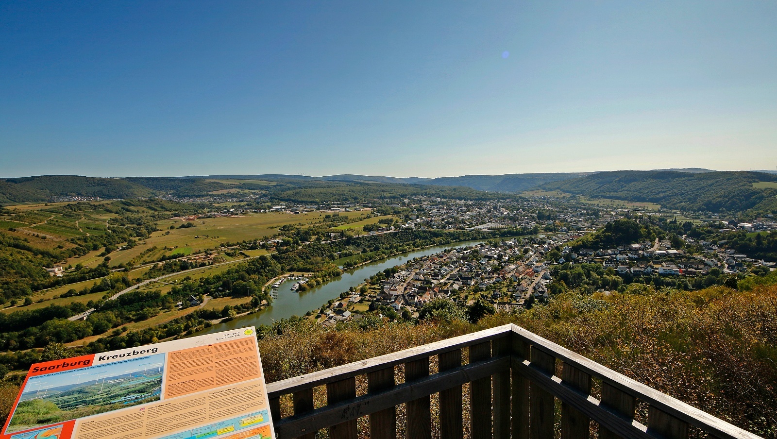 Ausgangspunkt dieser Wanderung ist der Ferienpark Wasberg in Saarburg. Von hier aus geht es am Ufer der Saar entlang in den kleinen Weinort Ayl. Vom Aussichtspunkt "Kreuzberg" aus bietet sich ein einzigartiger Blick in das Saartal. Hier bieten Informationstafeln zudem einen spannenden Einblick in die historischen Abschnitte der Erdgeschichte. Wie das Saartal wohl zur Zeit der Dinosaurier ausgesehen haben mag? Nach einer Pause mit atemberaubendem Ausblick geht es durch die Weinberge wieder zurück nach Saarburg.