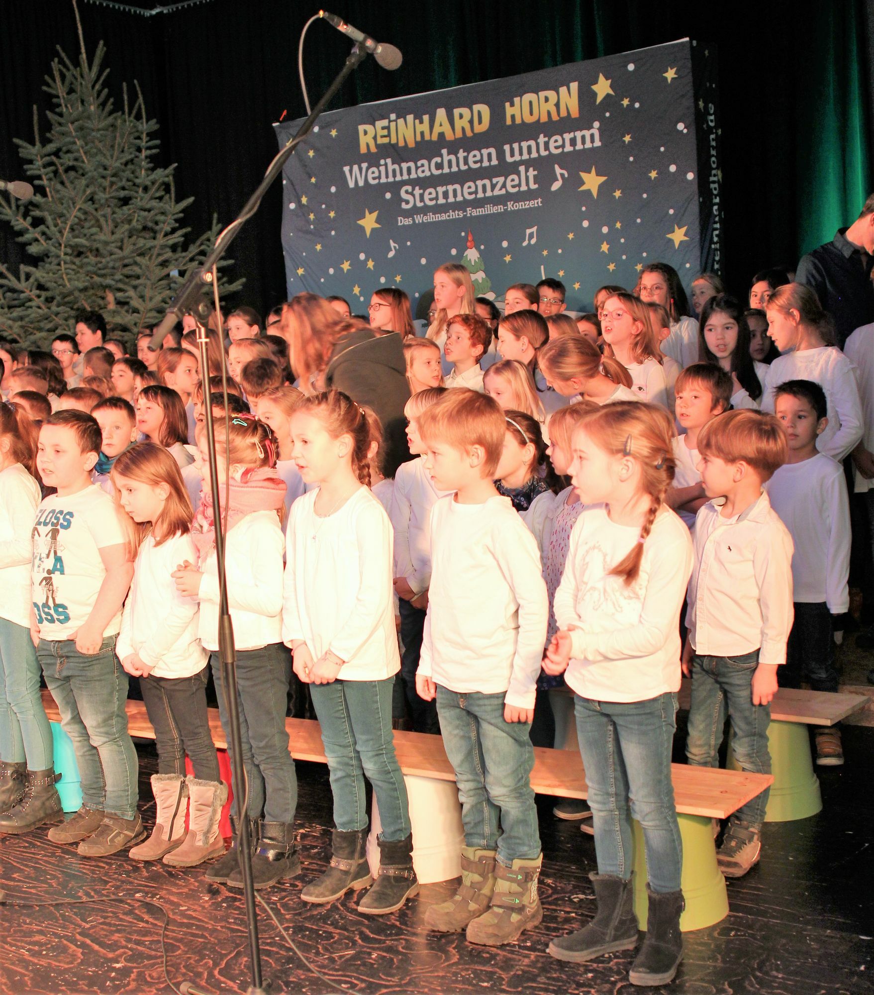 Ein für dieses Konzert gebildeter hundertzwanzigköpfiger Kinderchor unter der Leitung von Kathrin Wiedenfeld und Claudia Thielgen übte seit den Herbstferien voller Motivation und Vorfreude Advents- und Weihnachtslieder aus der Feder von Reinhard Horn für diesen Tag. Mit großer Freude gingen die Kinder auf die Bühne und standen direkt neben "ihrem" Künstler. Nach den ersten gemeinsamen Tönen schien die Aufregung und Nervosität wie weggeblasen. Die Mädchen und Jungen auf und vor der Bühne ließen sich von Reinhard Horn in seinen Bann ziehen. Sie lachten, sangen, klatschen und tanzten zur Musik. Sowohl der Lichtertanz als auch der Gesangswettbewerb zwischen Kindern und Erwachsenen zu "Applaus für den Nikolaus" machte ihnen großen Spaß. Der Schneemann Rock ´n` Roll zum Mittanzen gehörte zu den Höhepunkten an diesem Nachmittag. Neben temperamentvollen Stücken fanden aber auch ruhigere, besinnlichere und traditionelle Lieder großen Anklang. Die neunjährige Hannah sang gemeinsam mit Reinhard Horn mit glockenheller Stimme das Duett "Lieber, guter Weihnachtsmann" und machte allen Erwachsenen bewusst, was doch Kinder schon alles können. Der Liedtext "Merry Christmas-Frohe Weihnacht" wünscht ein Frohes Fest in sieben verschiedenen Sprachen. Der Weihnachtsgruß in vietnamesischer Sprache oder gar auf Kisuaheli klingt wie ein Zungenbrecher, wurde jedoch von den Kindern wie selbstverständlich und alltäglich ausgesprochen. Mit "Lichterkinder" erinnerte Reinhard Horn an sein Engagement als Botschafter für die Kindernothilfe e.V. und lenkte den Blick der Kinder und Erwachsenen behutsam auf die große weite Welt, in der alle Kinder die gleichen Rechte und Ausgangsbedingungen haben sollten. Zum Abschluss wurde gemeinsam das Lied "Weihnachten unterm Sternenzelt" gesungen. Nur eine Stunde mit dem Kinderchor, Reinhard Horn und seinem Team hat ausgereicht, um dem hektischen Alltag der Weihnachtsvorbereitungen zu entfliehen und ein Gefühl des Innehaltens, Genießens sowie der Festtagsvorfreude zu erleben.