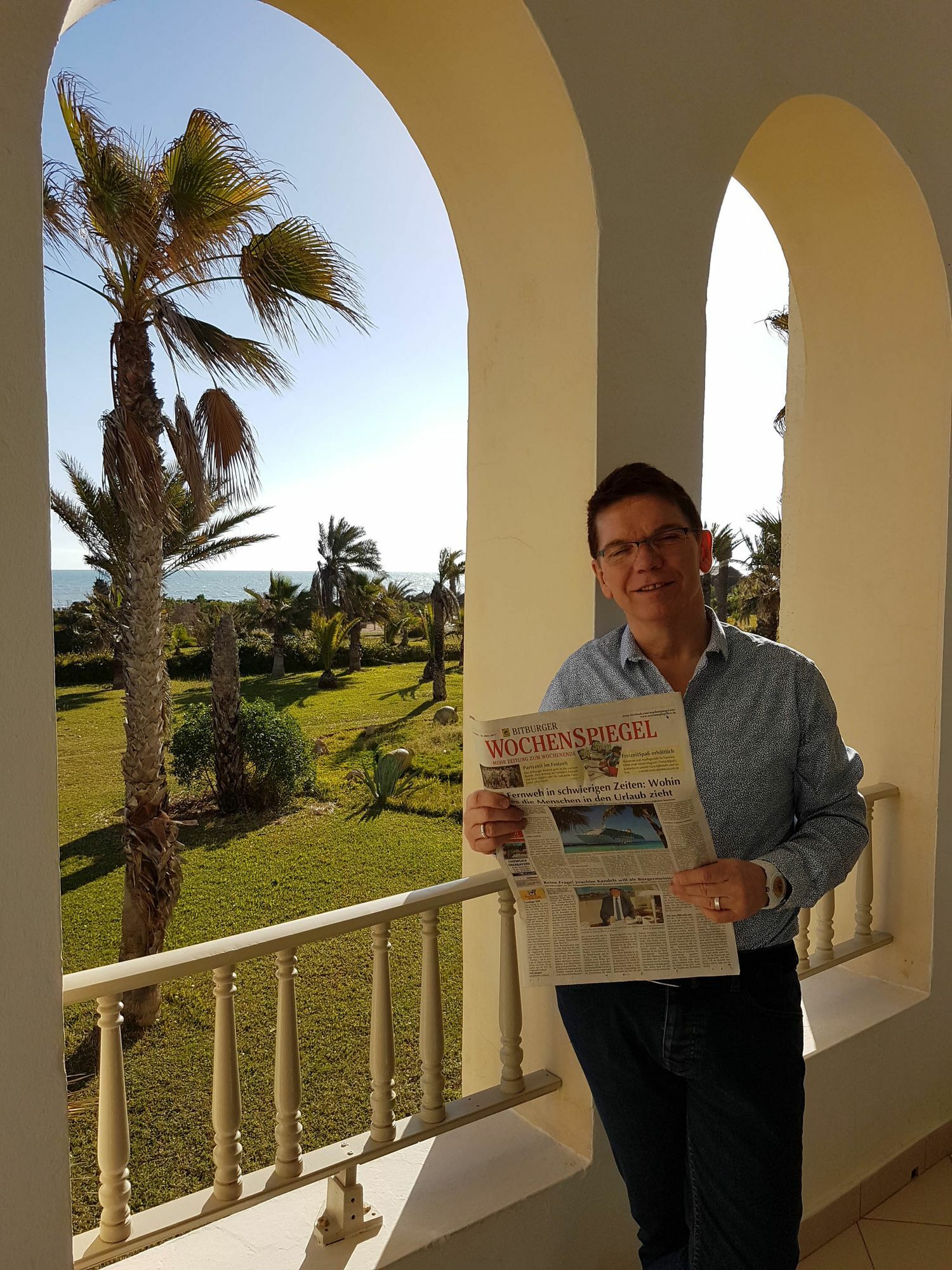 Als Bernd Pütz vom Luxtours Reisebüro Pütz in Bitburg dem Wochenspiegel das Interview zur Titel-Story der letzten Ausgabe gab (»Fernweh in schwierigen Zeiten«),  weilte er noch in Bitburg. Jetzt genießt er die Sonne auf Djerba. Zum Lesen hat er den Wochenspiegel mitgenommen.        Foto: privat