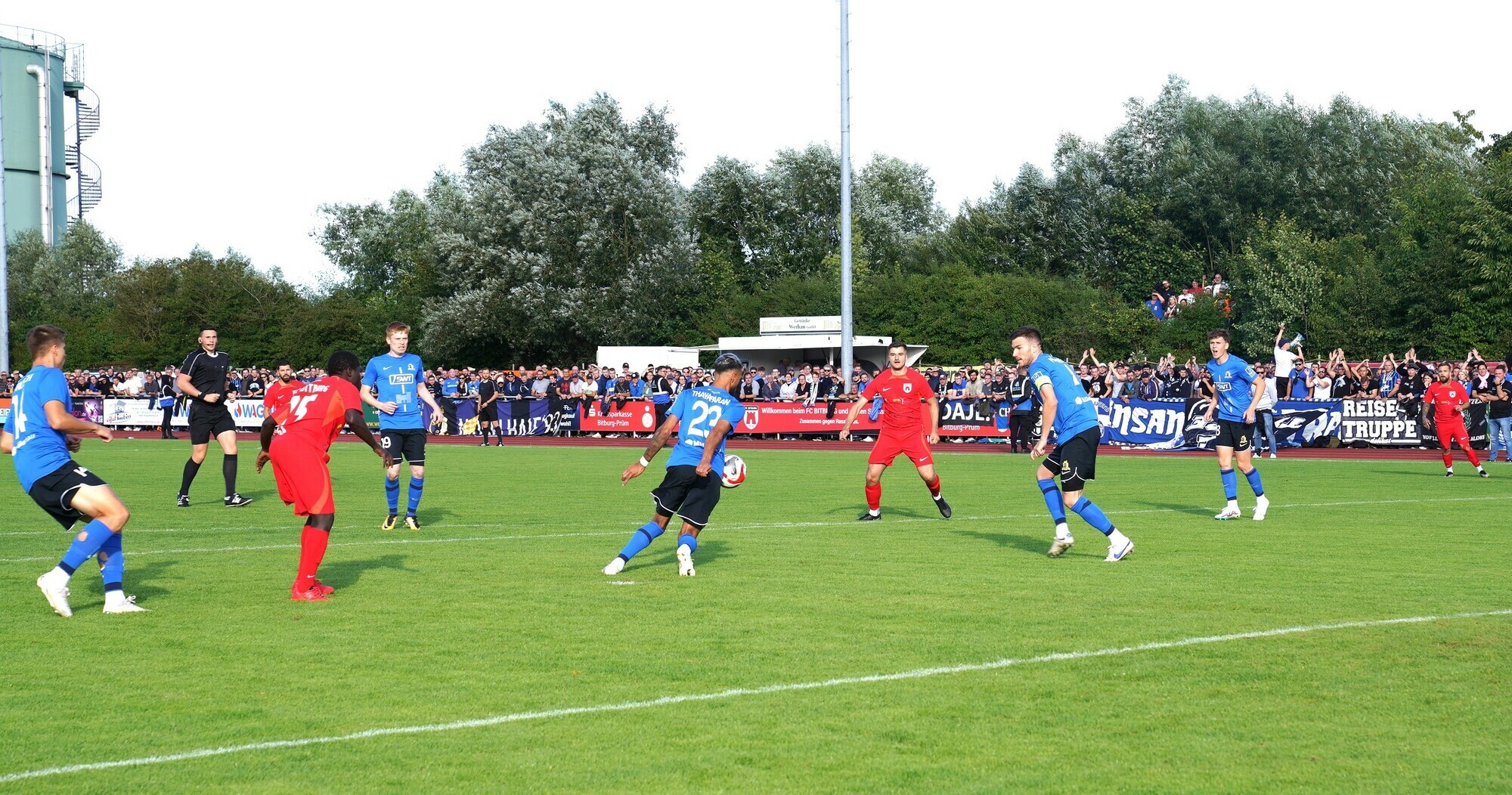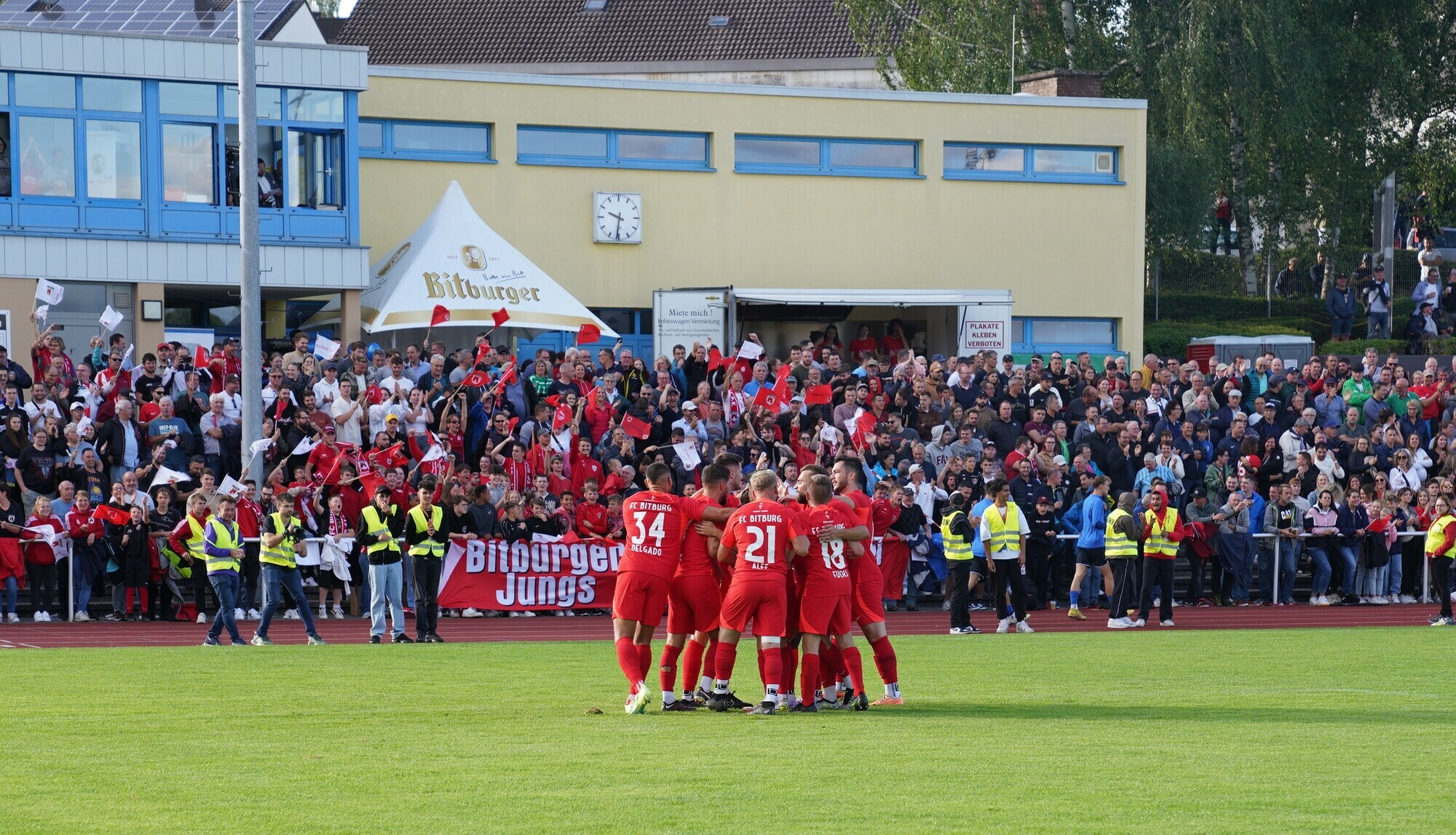 Zuschauerrekord mit Stadion Bitburg Ost, volles Haus mit 2900 Zuschauern, darunter viele Eintracht Fans beim Oberliga-Heimspiel des FC Bitburg gegen die Eintracht aus Trier. Und die Hausherren legten einen furiosen Start hin. Bereits in der 12. Minute schoss Pascal Müller nach Vorlage von Benjamin Siga das 1:0 für die Bierstädter Elf. Aber bereits sechs Minuten später glichen die Gäste aus Trier durch Dominik Kinscher zum 1:1 aus. Und die Domstädter blieben auch weiterhin Feldüberlegend und noch vor der Halbheit konnte Stürmer Boesen sich als Doppel-Torschütze (27. und 37. Minute (FE). Feiern lassen. Nach dem Seitenwechsel dominierten die Trierer weiter und bereits 120 Sekunden nach Wiederanpfiff versenkte Maurice Roth den Ball in den Maschen des Bitburger Kasten. Für die endgültige Entscheidung sorgte dann Jan Brandscheid mit dem 1:5 in der 69. Minute. Der FC Bitburg zeigte insgesamt eine solide Leistung , aber letztendlich fehlte doch die Routine und vor allem die Durchschlagskraft. Die Partei wurde souverän von Schiedrichter Justin Hoffmann geleitet.