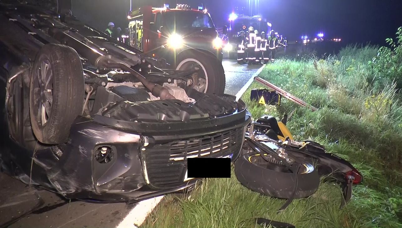 Eine 44-jährige Pkw-Fahrerin kam Dienstagnacht  auf der L 32 von Malbergweich/Staffelstein in Richtung Neidenbach/Waxbrunnen in einer lang gezogenen Linkskurve  aus bisher ungeklärter Ursache nach links von der Fahrbahn ab und kollidierte mit einer Schutzplanke. Das Fahrzeug überschlug sich und kam auf dem Dach liegend auf der Straße zum Stillstand. Nachdem die Insassen sich selbstständig aus dem Auto befreit hatten, kam aus der Gegenrichtung ein 18-jähriger Kradfahrer und fuhr in den  Pkw. Vermutlich als Folge dieses Zusammenpralls verstarben der Kradfahrer und der Pkw-Beifahrer. Die Fahrerin des Pkw wurde schwer verletzt. Foto: Agentur Siko