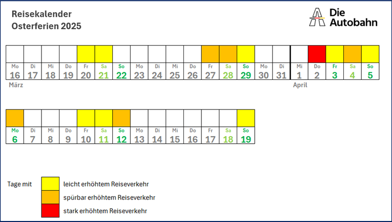 Noch stärker zunehmen wird der Verkehr vor und zu Ostern. Zu den erfahrungsgemäß verkehrsreichsten Tagen zählt der Gründonnerstag (2. April), an dem neben den Reisenden auch viele Pendler unterwegs sein werden. Die Autobahn GmbH empfiehlt, an diesem Tag die Stoßzeiten in den Ballungsgebieten möglichst zu meiden.