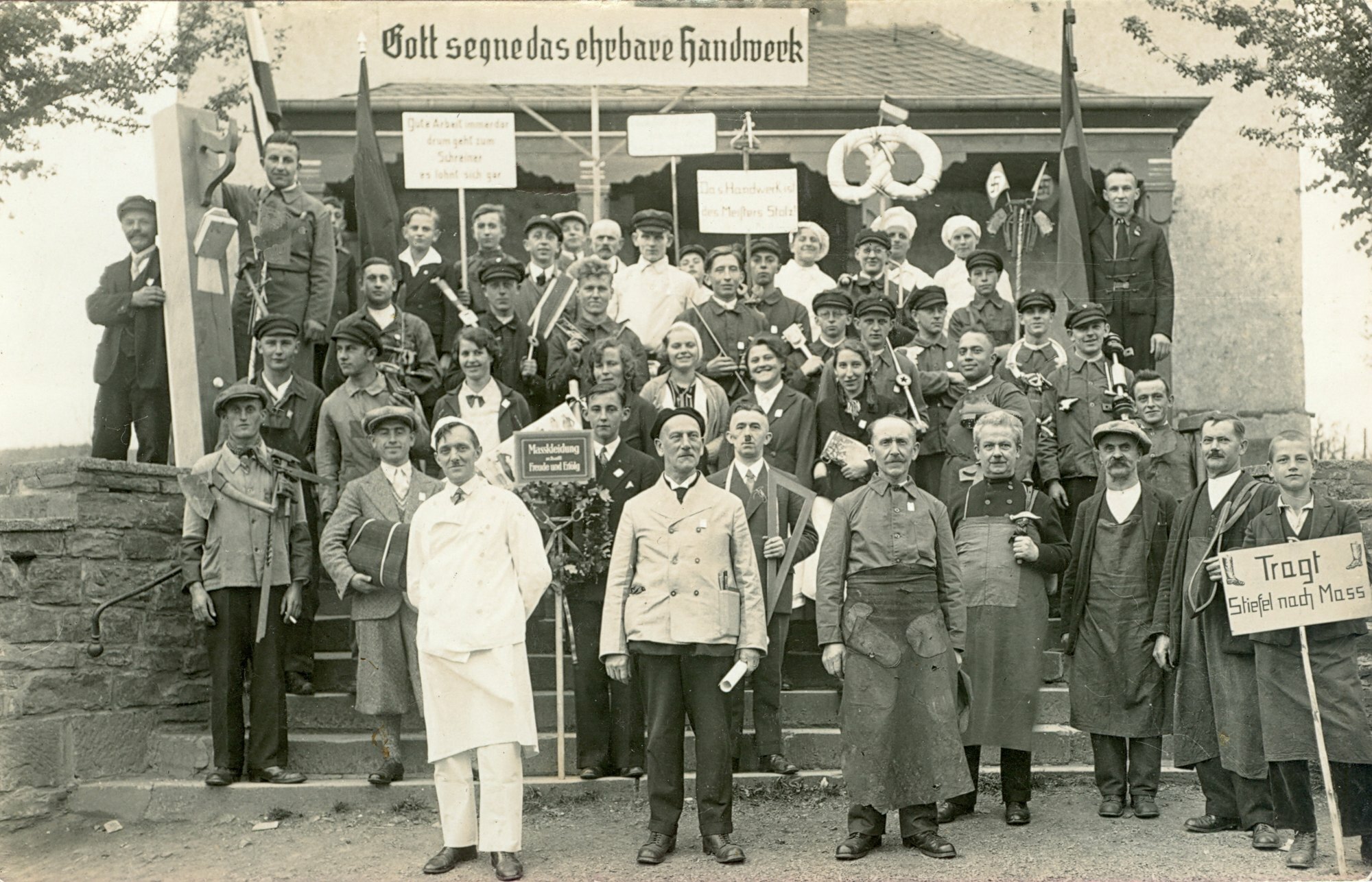Die Pronsfelder Handwerkerschaft versammelte sich auf der Freitreppe vor der Pfarrkirche zu diesem historischen Schnappschuss. Für die anschließende Maifeier hatte die Ortsgruppe der NSDAP zudem ein Festprogramm mit Umzug organisiert. Daran nahmen der Musikverein, eine Bauerngruppe mit Pferdekutschen und Reitersleuten, Fahnenschwenker, ein Pritschenwagen mit Bäuerinnen und die örtliche Handwerkerschaft teil. Nach dem Umzug gab es im Saal der Gastwirtschaft Chevalier Vorführungen der Volkstanzgruppe. Das ganze Dorf wohnte diesen Feierlichkeiten bei, so schrieb es ein Zeitzeuge im Jahre 1998 auf.