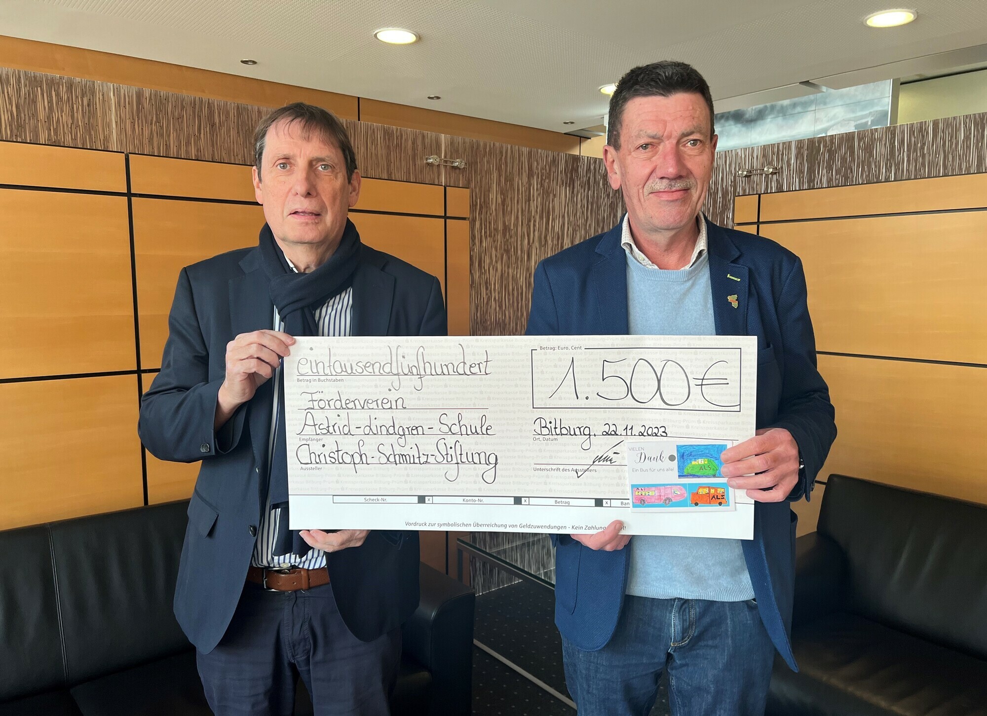 Mit einer großzügigen Spende unterstützt die Christoph-Schmitz-Stiftung die Hilfsaktion "Ein Bus für die Astrid-Lindgren-Schule" in Prüm. Stiftungsvorstand der Christoph-Schmitz-Stiftung, Horst Schilz überreichte dem Mitinitiator der Hilfsaktion, Wilfried Kootz eine Spende in Höhe von 1500 Euro. Die 2014 gegründete Stiftung unterstützt unter anderem bedürftige Kinder und Jugendliche im Eifelkreis Bitburg-Prüm.
