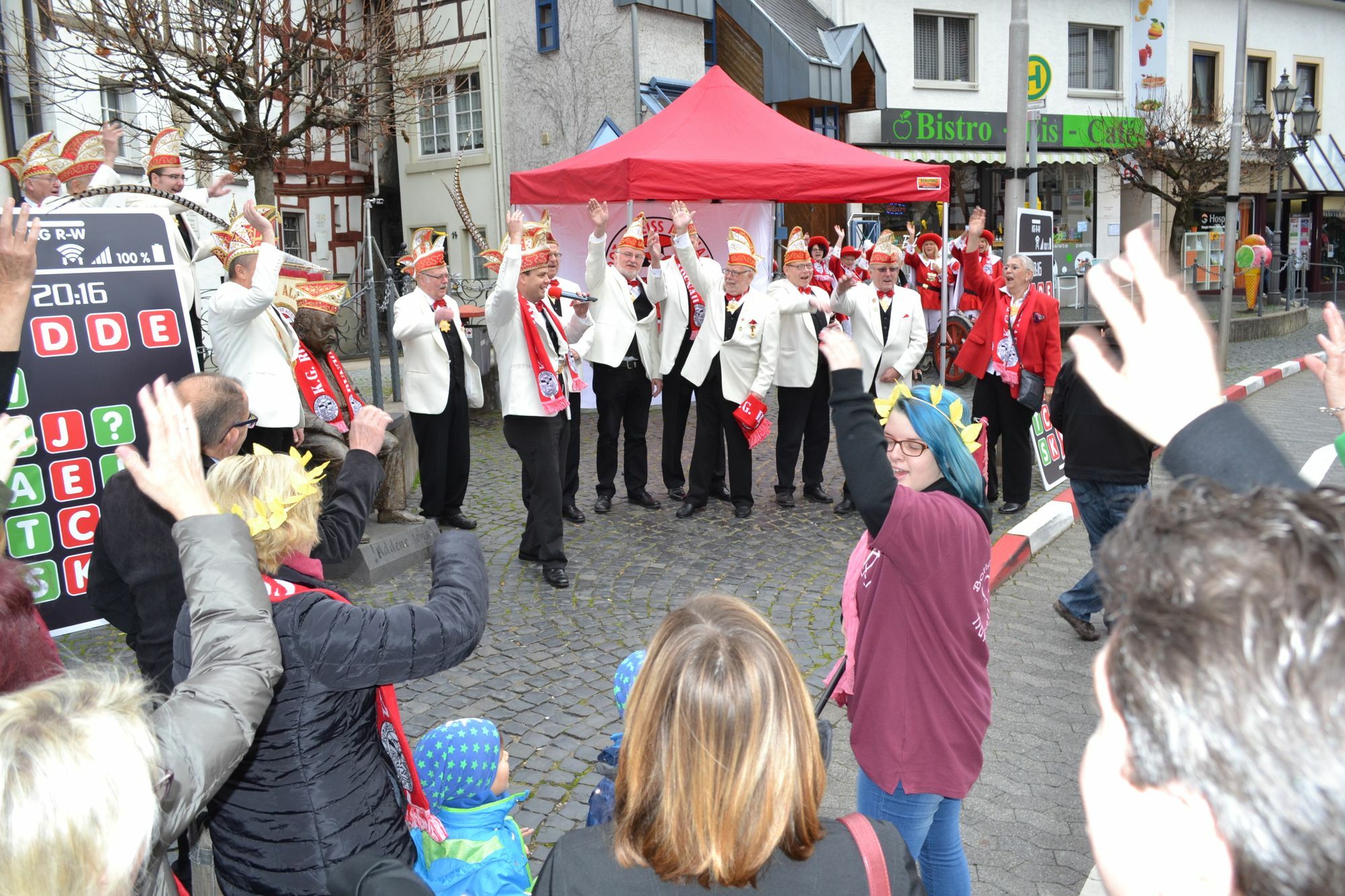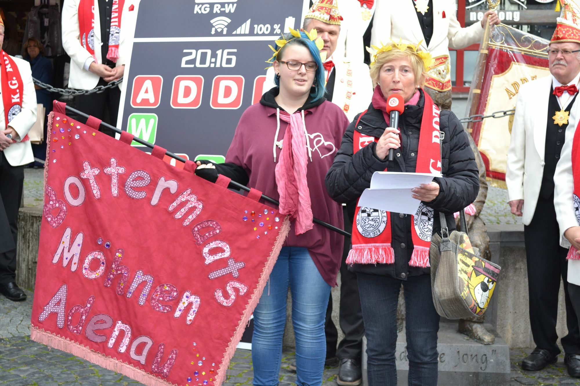 "Adde whats jeck?!" - so lautet das aktuelle Motto, das die KG Rot-Weiß auf dem Adenauer Markt rund um den Addene Jong präsentierte. Elferrat, 11. Regiment und Bottermaatsmöhnen waren ebenso angetreten wie viele Persönlichkeiten aus dem öffentlichen Leben. Sitzungspräsident Thomas Sebastian führte launig durch das Programm, in dem unter anderem neue Elferratsmitglieder wie der ehemalige Verbandsgemeinde-Bürgermeister Hermann-Josef Romes begrüßt wurden. Auch sein Nachfolger Guido Nisius, Stadtbürgermeister Arnold Hoffmann und KG-Präsident Eddy Rausch wünschten dem närrischen Volk einen tollen Fasteloven in Ruut un Wieß. Mit dem Elften im Elften hat in Adenau die fünfte Jahreszeit, die vor allem im neuen Jahr einige Höhepunkte, aber auch Neuerungen für das Narrenvolk bereithält, begonnen. Galasitzung am 16. Januar und Prunksitzung am 23. Januar geben den jecken Startschuss. Wie immer verwandelt sich die Hocheifelhalle in den »Gürzenich« des Addene Fastelovends. Wer die Hochkaräter des Adenauer Karnevals, Büttenredner, Tanzgruppen, Musikeinlagen und vieles mehr erleben möchte, sollte sich im Kartenvorverkauf am 9. Januar seine Tickets sichern. Mit der Seniorensitzung (31. Januar) sowie der Möhnensitzung und der Weiberdonnerstagsparty (beide am 4. Februar) folgen drei weitere närrische Leckerbissen, bevor ein neues Highlight bevorsteht: Statt des Lichterzuges steigt am Karnevalssamstag, 6. Februar, die »What’s Jeck Party 2016« in der Hocheifelhalle. Der größte Lindwurm der Region schlängelt sich traditionell mit dem Verbandsgemeinde-Sonntagszug durch Adenau. Die Jecken am Straßenrand dürfen sich auf »vell Spaß an dr Freud« sowie einen Kamellenstarkregen freuen. Kindersitzung und die Beerdigung des Karnevals beschließen am 9. Februar die Session der KG Rot-Weiß Adenau.