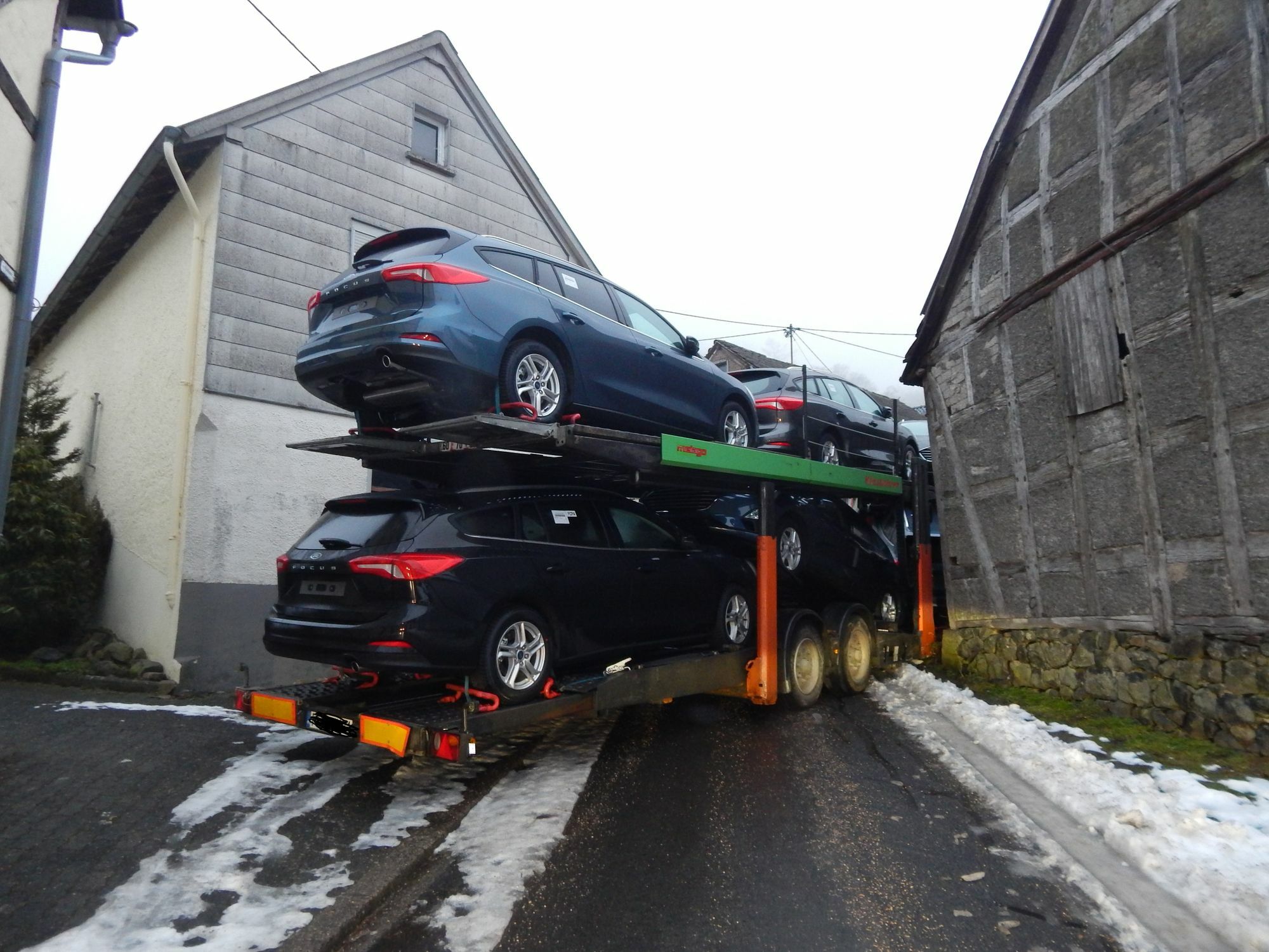 Eine vermeintliche Abkürzung hat den Fahrer eines Autotransporters am heutigen Freitagmorgen, 8. Februar - nicht nur - eine Menge Zeit gekostet. Gegen 5.30 Uhr meldeten Anwohner, dass sich ein Lkw auf der Aremberger Burgstraße festgefahren habe. Der Fahrer schaffe es nicht mehr, dass Fahrzeug zu befreien. Geladen hatten die Zugmaschine und der Anhänger Neuwagen. Laut Polizei hatte der Fahrer des Autotransporters auf "Empfehlung" seines Navigationsgerätes Nebenstrecken auf dem Weg nach Köln gewählt. In Aremberg folgte der Lkw-Fahrer mit seinem Autotransporter demnach dem Verlauf der Burgstraße bis eine Weiterfahrt - zumindest nach vorne - nicht mehr möglich war. Daraufhin habe der Fahrer versucht, rückwärts auszufahren, so die Polizei. Dabei stieß der Lkw bei insgesamt fünf Anwesen gegen Häuserecken, Grundstücksmauern, Regenrinnen und ähnliches sowie gegen eine Straßenlaterne. Schlussendlich hatte der Fahrer sein Gefährt laut Polizei derart zwischen Häusern eingekeilt bzw. im lockeren Erdreich neben der Fahrbahn festgefahren, dass auch ein Rückwärtsfahren nicht mehr möglich war. Ein Bergungsunternehmens befreite den Lkw gegen 12 Uhr aus der Lage. Den entstandenen Sachschaden an den Anwesen schätzt die Polizei auf einen insgesamt vier- bis fünftstelligen Eurobetrag. An der Zugmaschine und dem Anhänger sei ein Sachschaden in Höhe von rund 5000 Euro entstanden. Ein aufgeladenes Neufahrzeug sei ebenfalls geringfügig beschädigt worden.