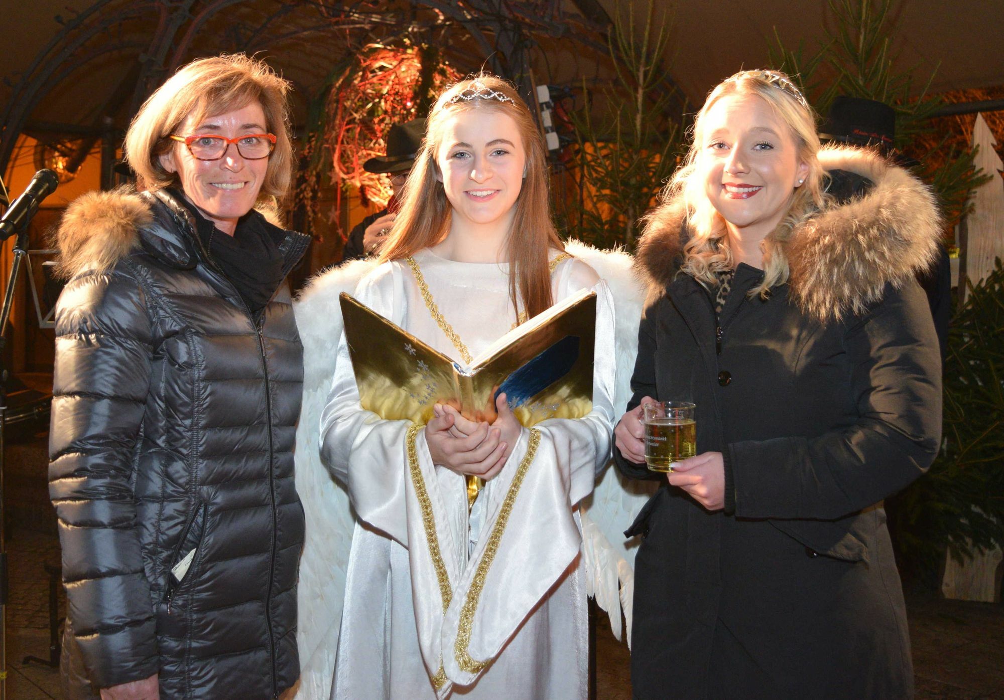 Martina Schuch (li., Werbegemeinschaft Ahrweiler), Engelchen Julia Sophie Rösch und Burgundia Elena Platz eröffneten den Weihnachtsmarkt. Foto: Scholl