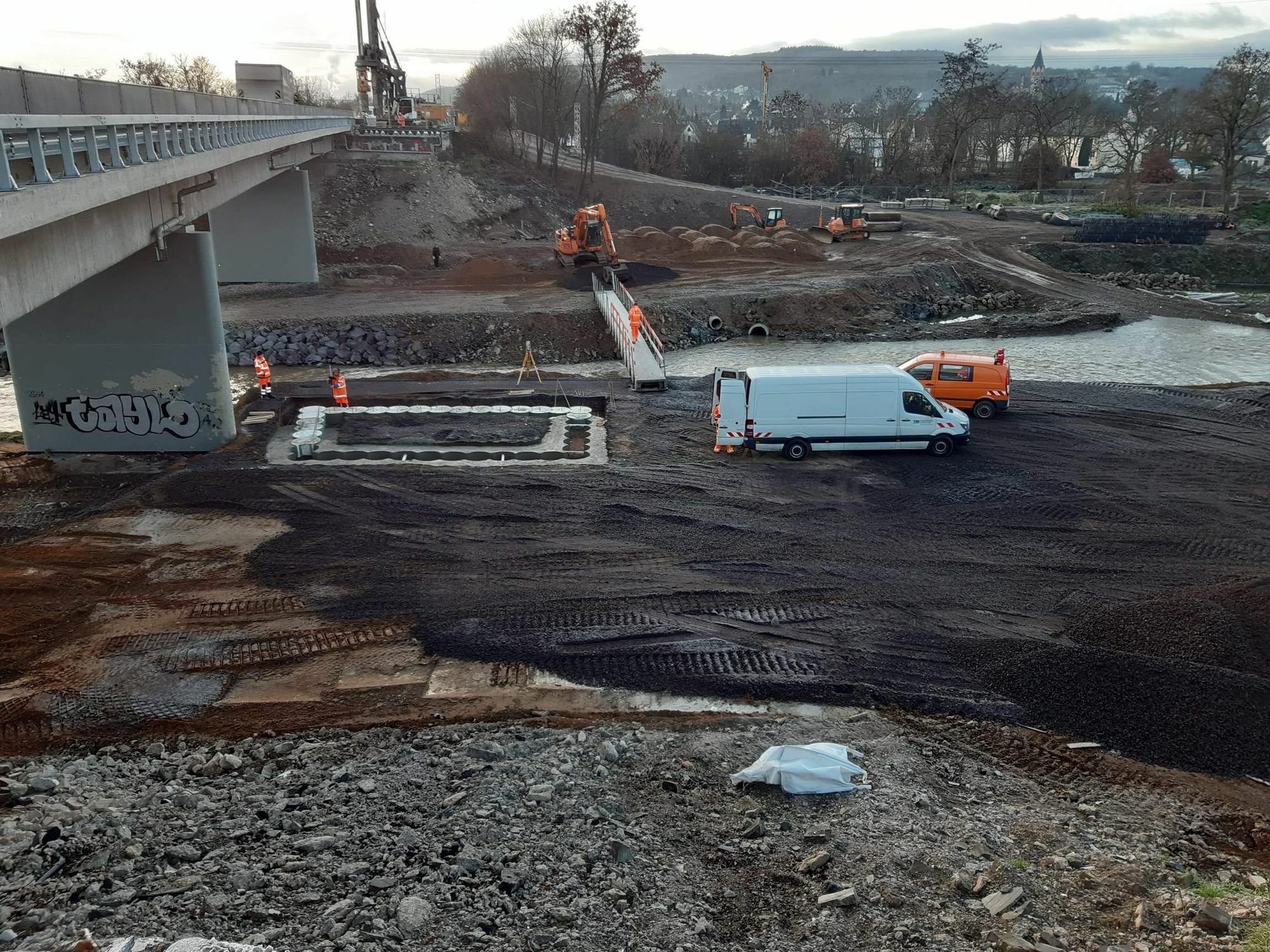 "Für den Neubau des eingestürzten Teils der Ahrbrücke an der B 9 bei Sinzig haben mit den jetzt gestarteten Bohrpfahlarbeiten die Bauarbeiten zum hochwassersicheren Wiederaufbau dieses Teilbauwerks begonnen", sagte Landesverkehrsministerin Daniela Schmitt. Im Vorfeld habe der LBM bereits umfangreiche Vorarbeiten zur Herstellung der notwendigen Infrastruktur (Anrampungen, Arbeitsebenen etc.) geleistet, die für einen Einsatz der im weiteren Verlauf der Baumaßnahme benötigten Großgeräte erforderlich waren. "Der Start der Bauarbeiten für die neue Ersatzbrücke an der B 9 bei Sinzig ist eine gute Nachricht für die Region. Der LBM gibt alles, um die Infrastruktur schnellstmöglich wiederaufzubauen. Er ist nicht nur dabei, allerorts die Straßen winterfest zu machen, sondern auch Großprojekte mit zentraler Verbindungsfunktion wie den Ersatzneubau der Ahrbrücke zügig voranzubringen. Die Mitarbeiterinnen und Mitarbeiter des LBM leisten hervorragende Arbeit, die Respekt und Anerkennung verdient. Sie wissen, wie wichtig eine funktionierende Infrastruktur für die Region ist", sagte Verkehrsministerin Daniela Schmitt. Die Ahrbrücke in Fahrtrichtung Süden in Sinzig wurde in der Flutkatastrophe durch die Unterspülung eines Pfeilerfundaments zerstört. Die Pfeiler der neuen Brücke werden auf 15 Meter tiefen Großbohrpfählen errichtet, um die Wiederholung eines derartigen Schadens sicher zu verhindern. Die dafür erforderlichen Vorarbeiten zur Herstellung einer Baugrube sind in vollem Gange. Die Bohrpfahlarbeiten werden, günstige Witterungsbedingungen und einen planmäßigen Verlauf vorausgesetzt, bis Februar 2022 andauern. Die gesamte Brücke soll nach derzeitiger Planung im dritten Quartal 2022 komplett fertiggestellt sein. Zur Optimierung der Gesamtbauzeit wird die Brückenplatte aus Halbfertigteilen hergestellt. Die Herstellung der Halbfertigteile erfolgt im Werk - parallel zu den Gründungsarbeiten und dem Bau der Pfeiler vor Ort. Sobald die Unterbauten fertiggestellt sind, steht die Montage der Fertigteilträger an, die dann vor Ort mittels Beton verbunden werden. Anfang September 2021 ist die B 9-Ahrbrücke Sinzig in Fahrtrichtung Norden wieder unter Verkehr gegangen. Den Verkehrsteilnehmern steht seitdem pro Fahrtrichtung jeweils eine Fahrspur zur Verfügung. Diese Verkehrsführung im Bereich der Baustelle wird bis zur Fertigstellung der neuen Brücke erhalten bleiben. Sie wird lediglich kurzeitig zum Einhub der Fertigteilträger in verkehrsschwachen Zeiten temporär gesperrt. Die Ahrbrücke überführt die B 9 in der Ortslage Sinzig über den Geländeeinschnitt der Ahr und schließt an den Hochkreisel Sinzig an.