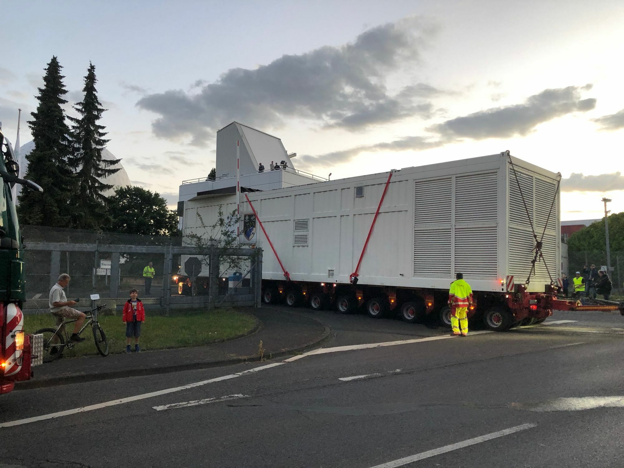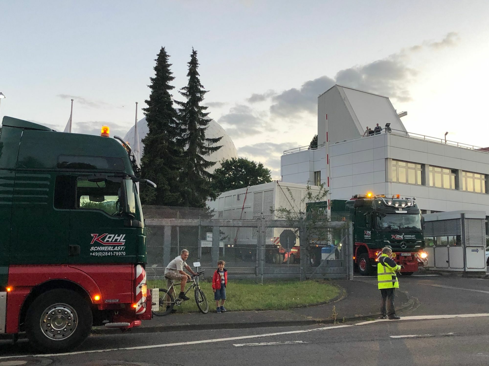 Beladen sind die Tieflader mit der Sender- & Empfangseinheit "Gestra", mit der zukünftig - vereinfacht ausgedrückt - Weltraumschrott im erdnahen Orbit aufgespürt werden soll. Und dieser wird für Satelliten, die uns mit Informationen versorgen - zum Beispiel für Navigationssysteme - immer häufiger zur Gefahr. Um diesen Schrott zu kartieren sind zwei verschiedene Radar-Systeme nötig: Eines, das einzelne Weltraumobjekte verfolgt und abbildet. Diese Aufgabe übernimmt das Weltraumbeobachtungssystem "Tira" am Fraunhofer-Institut für Hochfrequenzphysik und Radartechnik (FHR) in Wachtberg. Und ein weiteres, das die verschiedenen Objekte in einem großen Raumausschnitt aufspürt. Dies kann nur ein sogenanntes "Phased-Array-Radar" mit "einer hohen Reichweite und Strahlagilität" erfüllen und hier kommt "Gestra" ins Spiel. Jetzt, nach rund fünf Jahren Entwicklungs- und Bauzeit, ist das Weltraumbeobachtungsradar "Gestra" bereit zum Transport auf die Schmidtenhöhe bei Koblenz. Nachdem die beiden Container mit der Sender- und Empfangseinheit bereits am Freitag, 26. Juni, auf die Tieflader verladen wurden, sollte die Reise am Sonntagabend, 28. Juni, starten. Doch nur wenige Meter nach der Torausfahrt des Instituts war bereits Schluss. Schuld war ein defektes Hydraulikaggregat. Mit einem Tag Verspätung wurde der Versuch am Montagabend, 29. Juni, wiederholt und dieses Mal mit Erfolg. Inzwischen sind die beiden Schwerlasttransporter sowie die beiden dazugehörigen Radarkuppeln (Radome) unterwegs. Aufgrund des Gewichts und dem Umfang der Container und Kuppeln muss die kleine "Karawane" einen Umweg zum Zielstandort nehmen und rund 130 Kilometer zurücklegen. Und dabei darf nichts schiefgehen. Denn die Ladung ist etwa 40 Millionen Euro wert und rund 180 Tonnen schwer. Quelle und weitere Informationen online unter: https://www.fhr.fraunhofer.de/de/geschaeftsfelder/weltraum/gestra-den-erdnahen-orbit-stets-im-blick-jb2019.html