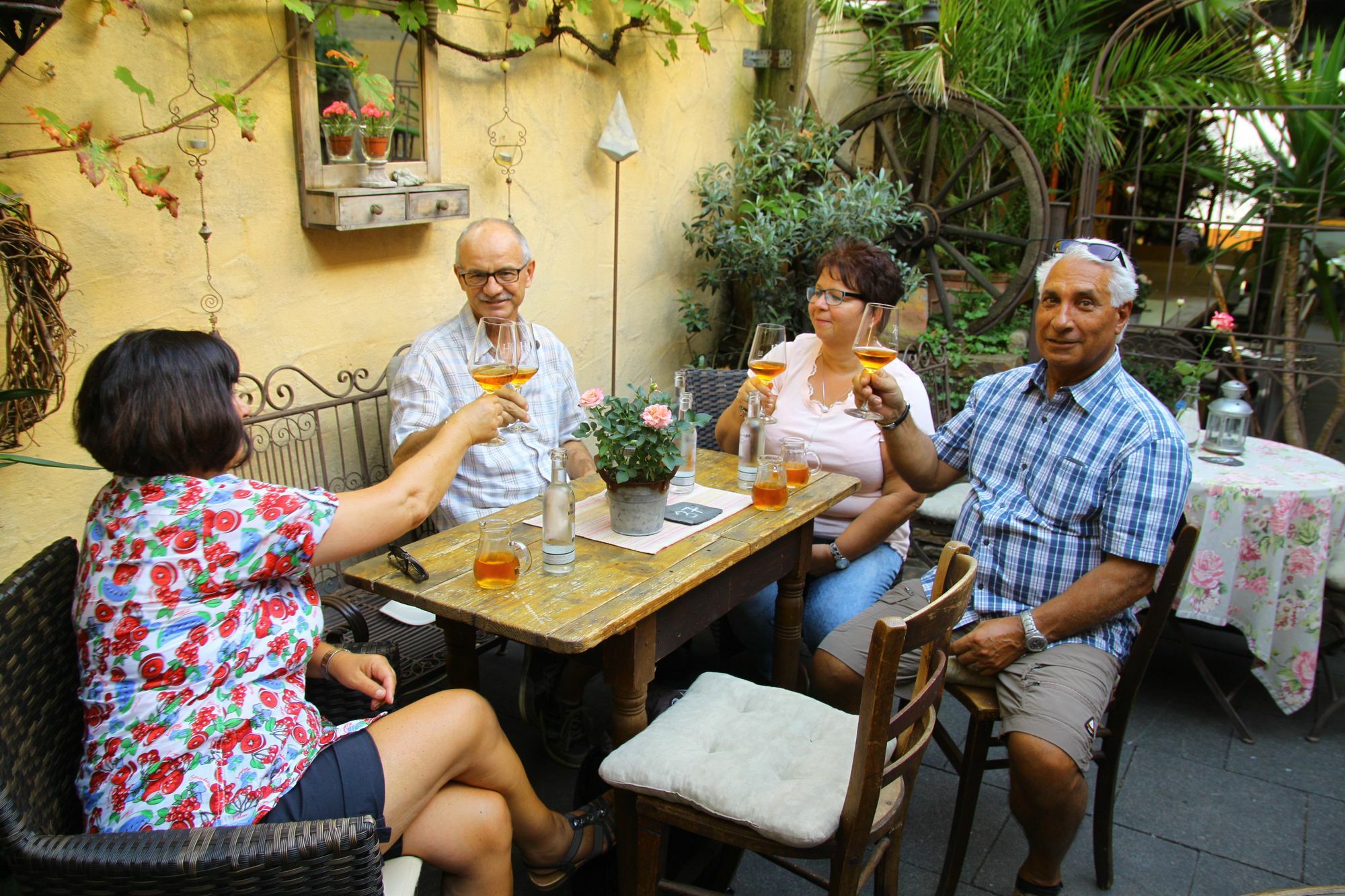 Die vier Besucher haben sich direkt einen gemütlichen Platz gesichert und bestellen – eher untypisch - Traubensaft. Eigentlich soll die Straußwirtschaft den Winzer eine weitere Absatzmöglichkeit für ihren Wein bieten. Deshalb unterliegt sie gewissen Auflagen.