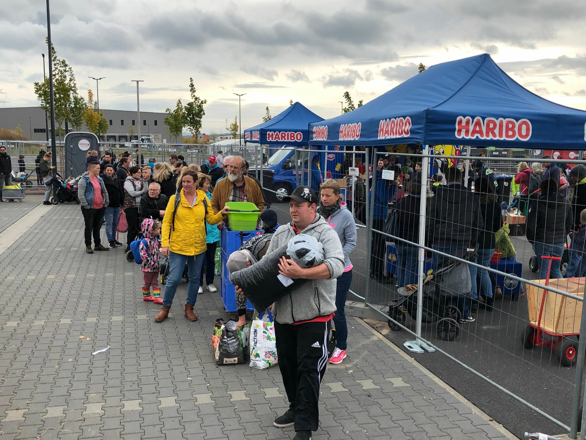 Täglich werden im Innovationspark Rheinland in der Grafschaft große Mengen an Waren verschoben. Seit heute Morgen quälen sich zahlreiche Menschen sogar zu Fuß den langen, von Bauzäunen markierten Anstieg zu einem der Werksgelände hoch. Vor und hinter sich her schieben und ziehen sie alles mögliche, was Räder hat. Sackkarren, Bollerwagen, Mülltonnen, Skateboards, Kinderwagen - in und auf all diese Transportmitteln karren sie ohne Unterlass Eicheln und Kastanien durch die Gegend. Bis morgen Abend werden es rund 10.000 Menschen gewesen sein. Doch die Mühe lohnt sich. Denn am Ende es Weges tauscht der Fruchtgummihersteller Haribo an seinem Hauptsitz, Dr.-Hans-und-Paul-Riegel-Str. 1 in der Grafschaft, nun im dritten Jahr Kastanien und Eicheln gegen Gummibärchen, Saure Kracher, Tropifrutti und Co. ein. Am heutigen Freitag, 11. Oktober, kann man sich noch bis 16 Uhr anstellen. Am morgigen Samstag wird von 7 bis 14 Uhr getauscht. Für zehn Kilo Kastanien oder fünf Kilo Eicheln gibt es je ein Kilo Haribo. Maximal 50 Kilo der Waldfrüchte können pro Person eingetauscht werden. Insgesamt findet die Kastanienaktion zum 83. Mal statt. Früher wurde am Stammhaus in Bonn getauscht, seit dem Umzug in den Innovationspark Rheinland am neuen Firmensitz. Rund 65 Haribo-Mitarbeiter sind heute im Einsatz, die die Kastanien wiegen, sammeln und die Süßwaren ausgeben. Auch das Rote Kreuz und die Freiwillige Feuerwehr der Grafschaft sind vor Ort. Erstmals werden bei der Kastanienaktion Förderbänder eingesetzt. Sie transportieren die Früchte direkt in riesige Container. Die kaufmännischen Auszubildenden kümmern sich um das Kinder-Spieleparadies. Und auch der Goldbär lässt sich blicken. Am heutigen Freitagmorgen zeichnete sich bereits ab, dass Haribo mit vielen Besuchern rechnen kann. Gegen 9 Uhr tummelten sich schon zahlreiche Besucher auf dem Platz. Die Wartezeiten waren mit 10 bis 15 Minuten allerdings noch ertragbar. Zu Stoßzeiten nehmen die Kastaniensammler sogar bis zu dreieinhalb Stunden Wartezeit in Kauf. Während die Tauschaktion den Kindern in Rheinland-Pfalz ein Trost für das Ende der Herbstferien sind, versüßt sie den Schülern im benachbarten Nordrhein-Westfalen den Start in ihre Ferien. Da zahlreiche NRW-Schüler heute noch die Schulbank drücken müssen, rechnet Haribo morgen mit zahlreichen Besuchern. Im vergangenen Jahr kamen 175 Tonnen Kastanien und 86 Tonnen Eicheln zusammen. Sie werden an Wildgehege in Deutschland und Österreich verteilt, um sie beim Futter für den Winter zu unterstützen.