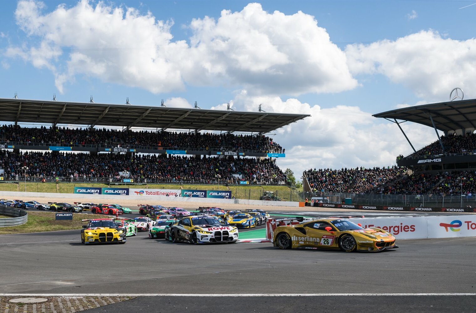 Pünktlich um 16 Uhr startete das 24h-Rennen auf dem Nürburgring vor vollen Tribünen und Sonnenschein. Nach einer spannenden Phase mit etlichen Führungswechseln zu Beginn hat sich nach fast zwei Stunden das Rennen etwas beruhigt. Die Abstände sind eng. Nach zwei Stunden führt der Mercedes-AMG GT3 #12 vom Mercedes-AMG-Team Bilstein vor dem Mercedes-AMG GT3 vom Mercedes-AMG Team Get Speed und dem Audi R8 LMS Evo2 #22 vom Audi Sport Team Car Collection. Der Ferrari 488 GT3 Evo20 #26 von octane126, der von Pole Position ins Rennen gestartet ist, wurde relativ früh nach hinten durchgereicht. Durch eine Berührung, der ein massiver Reifenschaden folgte, ist er inzwischen weit zurückgefallen.