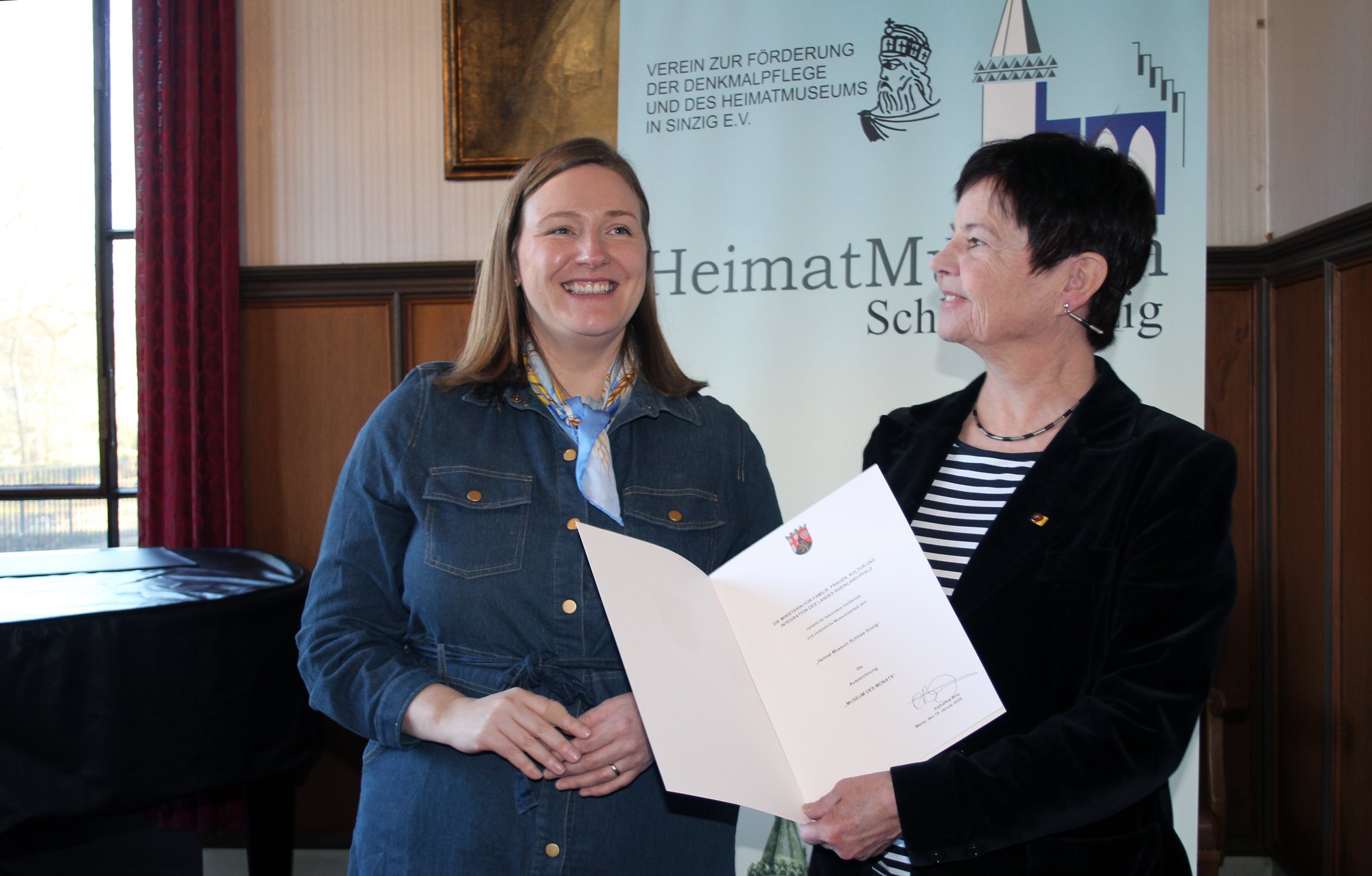 Sinzig. Im feierlichen Rahmen wurde am Samstag, 19. Januar 2025 dem Heimatmuseum der Stadt Sinzig im Schloss die Auszeichnung „Museum des Monats“ des Ministeriums für Familie, Frauen, Kultur und Integration verliehen. Kulturministerin Katharina Binz überreichte Museumsleiterin Agnes Menacher die mit 1.000 Euro dotierte Auszeichnung. „Das Heimatmuseum im Sinziger Schloss bietet Besucherinnen und Besuchern eine spannende Reise durch die Jahrtausende, die die Geschichte an Rhein und Ahr beleuchtet. Dabei schlägt es einen weiten Bogen von der Altsteinzeit über die Antike bis ins 20. Jahrhundert. Durch engagierte Vermittlungsarbeit und abwechslungsreiche Veranstaltungen schafft das Museum einen Raum für Begegnung und Austausch. Damit fördert es den Dialog über die vielfältige Kultur und Geschichte der Region“, so Kulturministerin Binz.
