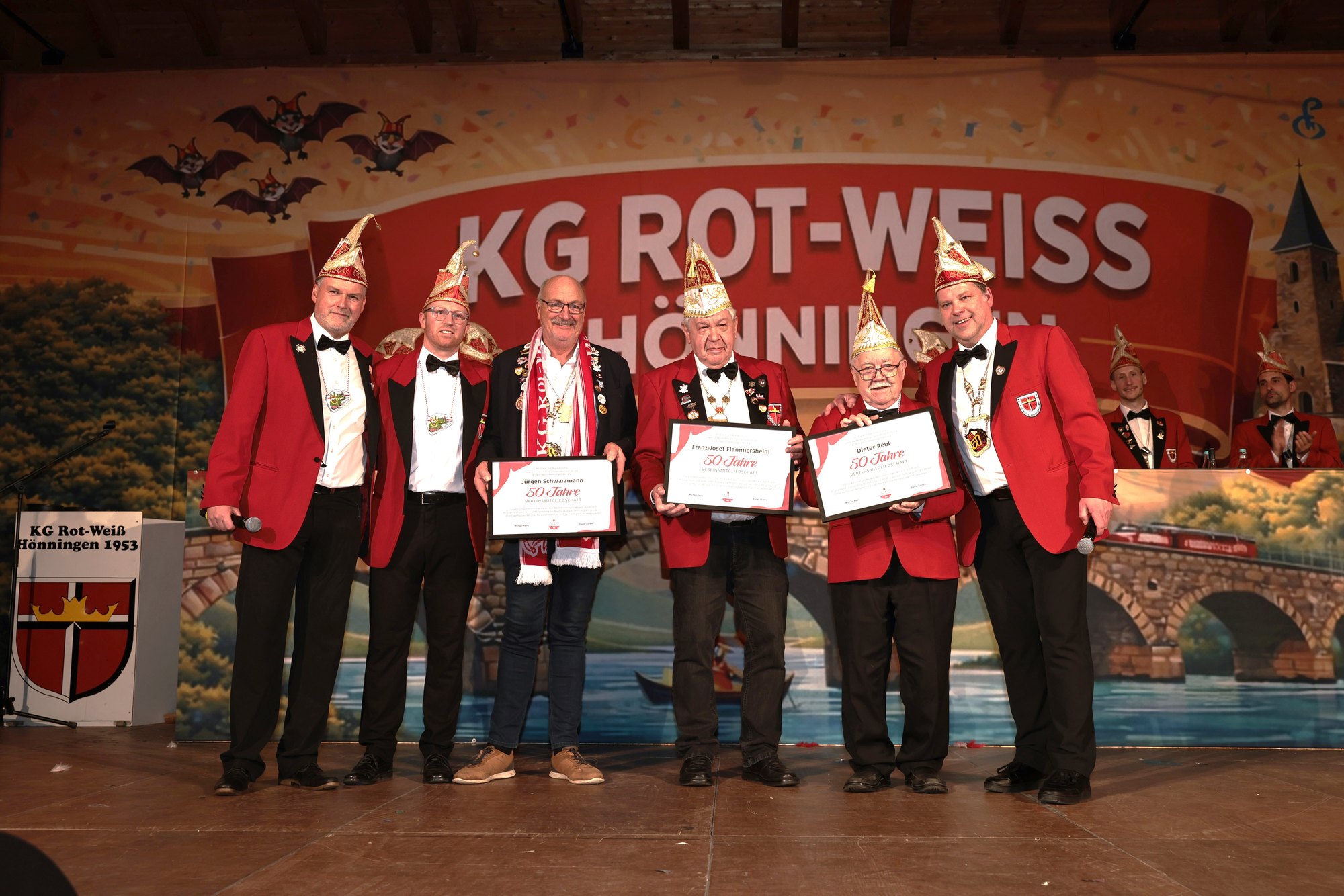 Der Karneval lebt von hoch engagierten Menschen, die oft jahre-, ja jahrzehntelang ihr Herz dem Karneval verschrieben haben. So wurden mit großer Anerkennung und herzlichem Dank einige Mitglieder besonders geehrt: Hans-Josef Weber, Heinz Weber, Lambert Jock, Paul Günter Minwegen, Franz-Josef Flammersheim, Dieter Reul, Jürgen Schwarzmann. In unterschiedlichen Funktionen haben sie alle dazu beigetragen den Hönninger Karneval zu dem zu machen, was er heute ist. Ihre Leidenschaft für den rheinischen Karneval, ihr unermüdlicher Einsatz hat Akzente gesetzt! Großer Jubel unter den Gästen.