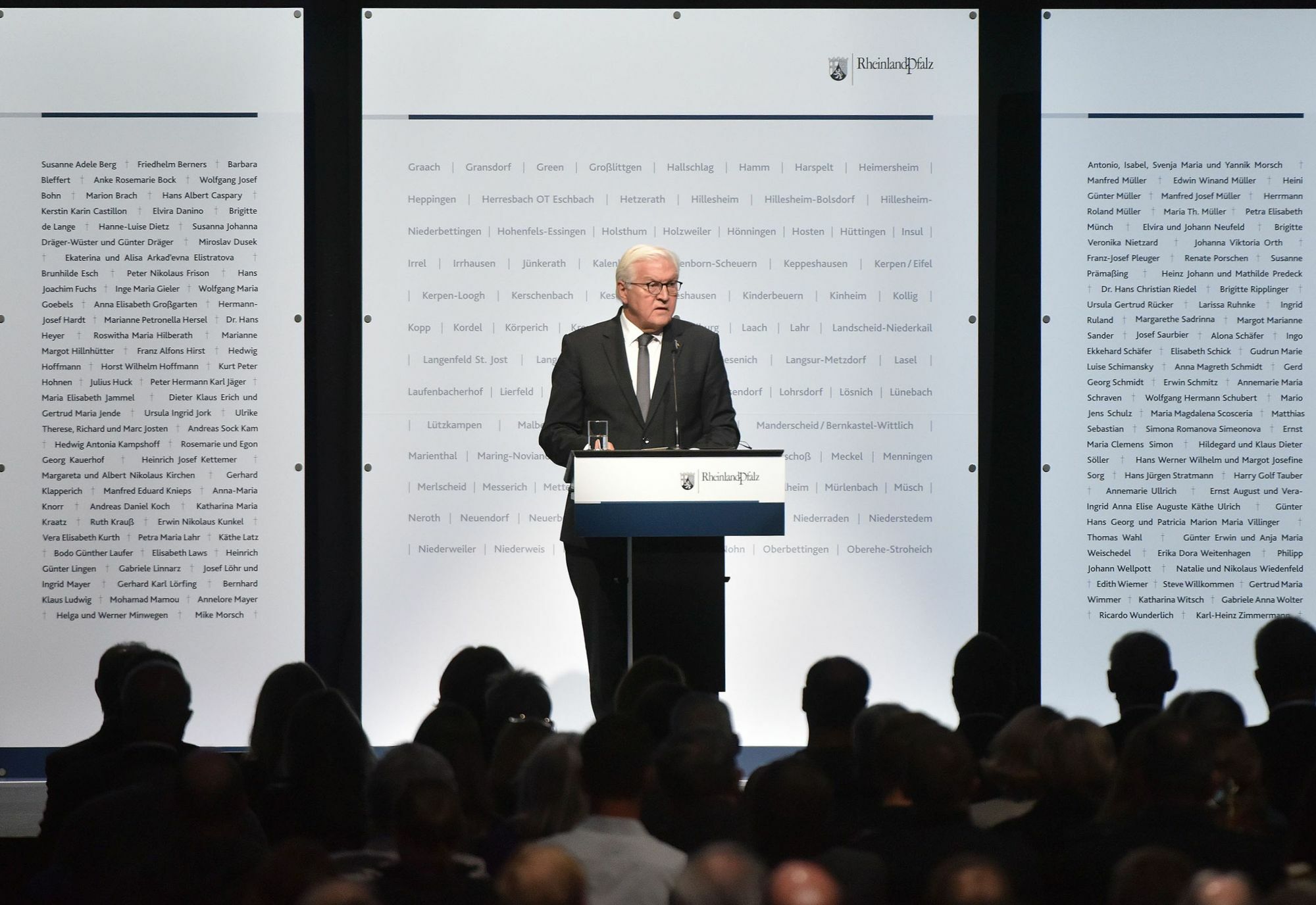 Mehrere Meter hoch hatten sich in der Ringarena am Nürburgring in den Tagen nach der Flutkatastrophe die Spenden der Bevölkerung gestapelt und so die große Hilfsbereitschaft dokumentiert. In dieser Halle kamen am Mittwoch Bundespräsident Frank-Walter Steinmeier, Ministerpräsidentin Malu Dreyer, Vertreter von Hilfsorganisationen, die im Ahrtal von Beginn an helfen, aber auch Betroffene und Hinterbliebene zum Staatsakt zusammen, um den 134 Verstorbenen der Flutkatastrophe zu gedenken. Auf fünf großen Tafeln waren im Hintergrund der Bühne alle betroffenen Orte sowie die Namen aller Opfer aufgeführt. »Ich habe enormen Respekt davor, dass Sie trotz Ihrer Verzweiflung nicht aufgegeben haben. Dass Sie trotzdem anpacken, nach vorne blicken, so unendlich schwer es auch oft fallen mag«, sagte der Bundespräsident: »Ich bin gekommen, um Ihnen zu sagen: Wir stehen an Ihrer Seite. Wir wissen, dass in Ihrem Leben nichts mehr ist, wie es war. Aber Sie sollen heute wissen: Auf Ihrem Weg zurück ins Leben lässt Ihr Land Sie nicht allein.« »Ich weiß, dass die größte Sorge vor Ort jetzt ist, vergessen zu werden, wenn sich die Kameras wieder auf andere Ereignisse richten. Dass viel versprochen wird, aber am Ende alles mühsam erstritten werden muss. Den Betroffenen in den Hochwassergebieten sage ich: Niemand wird vergessen!«, versprach die Ministerpräsidentin. Am Wochenende habe sie sich mit den Eltern der jungen Feuerwehrwehrfrau aus der VG Adenau getroffen, die im Einsatz ihr Leben ließ: »Mit ihnen zu sprechen, zerreißt einem das Herz.« Neben allen Helfern dankte Dreyer auch den Mitarbeitenden in den Verwaltungen, den Bürgermeistern und Landräten und der Landrätin in den betroffenen Regionen. Cornelia Weigand, Bürgermeisterin der schwer getroffenen VG Altenahr, beschrieb die Ahr als "früher unsere launige Weggefährtin, die jetzt mit all ihren Zuläufen zu einem Monster, einem brutalen Ungeheuer wurde". Sie bedankte sich »bei denen, die nicht lange gefragt, sondern angepackt haben – jeden Tag neu«. Ebenso neu müsse das Leben an Flüssen gedacht werden. An die Politik appellierte sie, möglichst schnell Perspektiven und Planungen aufzuzeigen. »Wie sollen die Menschen den Wiederaufbau planen ohne zuverlässige Richtschnur?«, fragte sie. Sie wünsche sich Geschwindigkeit eine bundesweite Koordination, damit die betroffenen Regionen beim Aufbau nicht um die besten Köpfe konkurrieren. »Wir brauchen jetzt und in Zukunft Mut, weil sich schnelle Entscheidungen später auch als falsch herausstellen können«, so die Bürgermeisterin. In seinem Beitrag berichtete Thomas Pütz, der den Helfershuttle im Ahrtal organisiert, von der Solidarität, von der die Helfer erzählen: »Man sagt: Wenn du das Vertrauen in die Menschen verloren hast, geh ins Ahrtal, dort wirst du eines Besseren belehrt.« Sein Lieblingszitat, das den Zusammenhalt im Ahrtal zeige, sei: "Alle elf Minuten verliebt sich ein Helfer ins Ahrtal." Eindringlich appellierte er: »Jetzt ist es Aufgabe der Politik, der Behörden und Krisenmanagements, diese Solidarität, diesen Mut zu schützen und diesen Funken am Leben zu halten.« Die Menschen erwarten, dass man die besten Ingenieure und Köpfe zusammenhole. Besonders berührend war die Schilderung von Wilfried Laufer, der mit seinem Vater Bodo Laufer in Altenahr das »Weineck« betrieb. Bodo Laufer starb in den Fluten der Ahr. Am Abend des Katastrophentags wollten sie gemeinsam Essen gehen. Die Feuerwehr habe per Lautsprecher gewarnt, die Häuser vor Hochwasser zu sichern. »Das habe ich längst gemacht, dann können wir gleich los«, habe sein Vater gesagt. Zuvor fuhr Wilfried Laufer noch einmal heim. Doch als er zurück wollte, war der Weg zu seinem Vater nach Altenahr eine Schlammlawine versperrt. Das berichtete er seinem Vater am Telefon. »Ok, dann sehen wir uns morgen«, waren daraufhin die Worte seines Vaters - die letzten, die er je von ihm hörte. »Drei Tage später hat man ihn 25 Kilometer Ahr abwärts gefunden.«