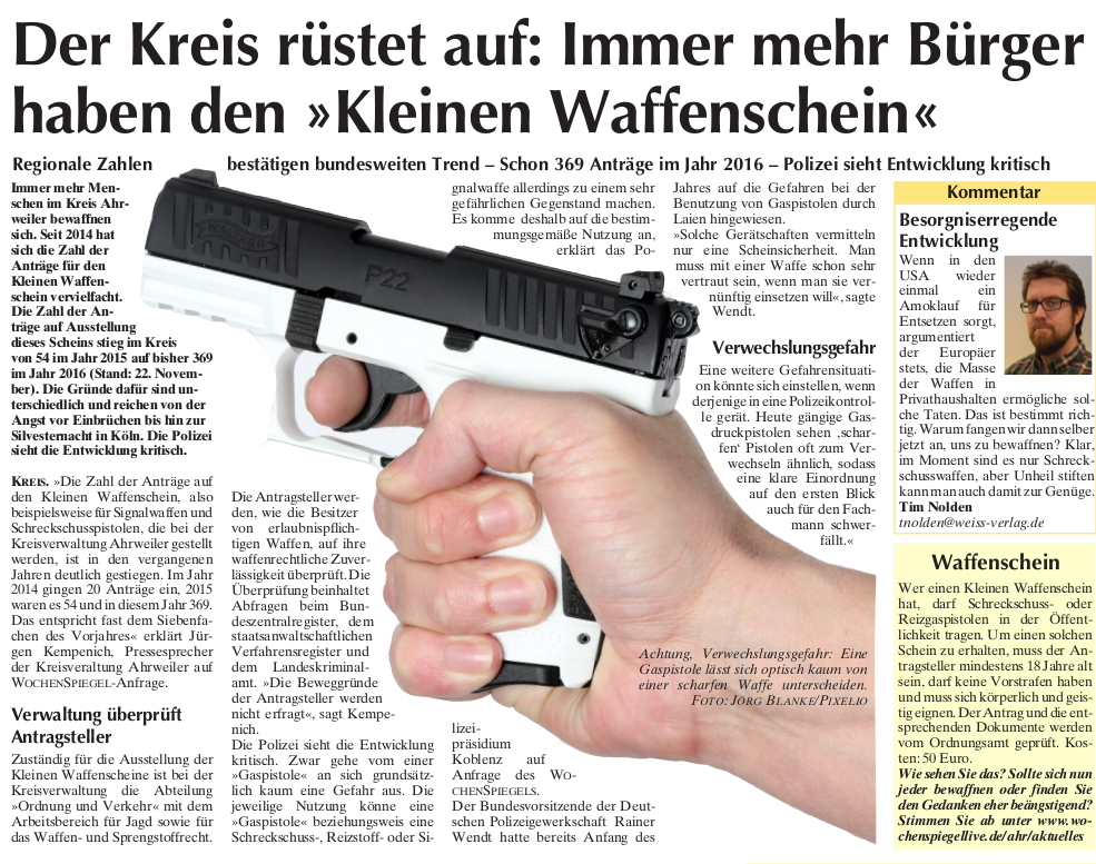 »Die Zahl der Anträge auf den Kleinen Waffenschein, also beispielsweise für Signalwaffen und Schreckschusspistolen, die bei der Kreisverwaltung Ahrweiler gestellt werden, ist in den vergangenen Jahren deutlich gestiegen. Im Jahr 2014 gingen 20 Anträge ein, 2015 waren es 54 und in diesem Jahr 369. Das entspricht fast dem Siebenfachen des Vorjahres« erklärt Jürgen Kempenich, Pressesprecher der Kreisveraltung Ahrweiler auf WochenSpiegel-Anfrage.