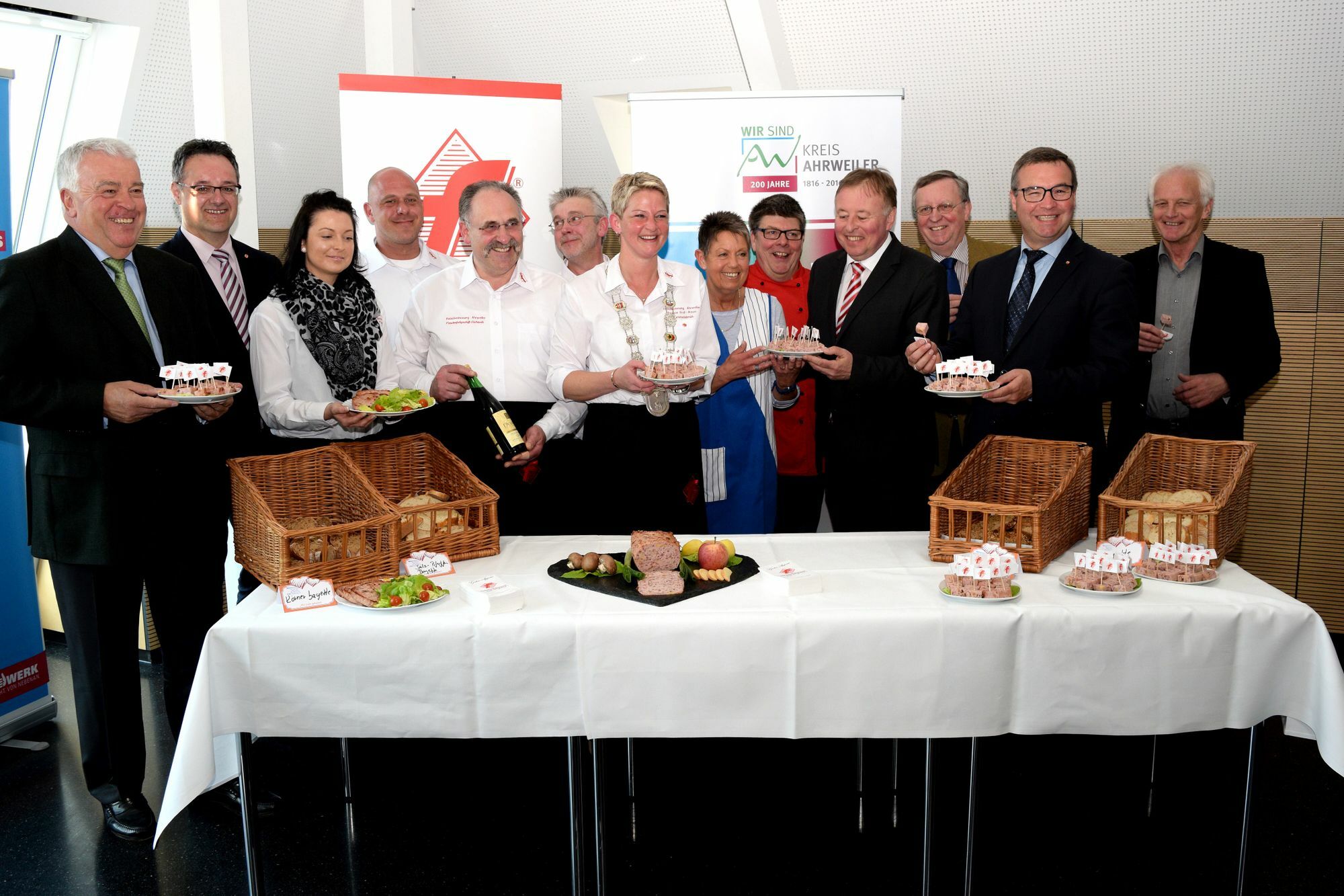 Was gab es vor 200 Jahren, was es heute noch gibt? Diese Frage hat die Fleischer-Innung Ahrweiler jetzt beantwortet, besser gesagt: per Küchenrezept zusammengestellt: Wurst mit bestimmten Zutaten. »AW-Wurst 2016« nennt sich das Produkt, das die Fleischer jetzt präsentiert haben. Landrat Dr. Jürgen Pföhler findet die Eifeler Spezialität – abgesehen vom »exzellenten Geschmack« – bemerkenswert. Die Zutaten? Die verriet Dagmar Groß-Mauer, Obermeisterin der Fleischer-Innung: Rind- und Schweinefleisch, Äpfel, Kartoffeln, Pilze, Lauch und Traubensaft, alles aus der Region. Hergestellt wird die »AW-Wurst«, die es ab sofort in den Innungsbetrieben zu kaufen gibt, übrigens wie Fleischkäse.