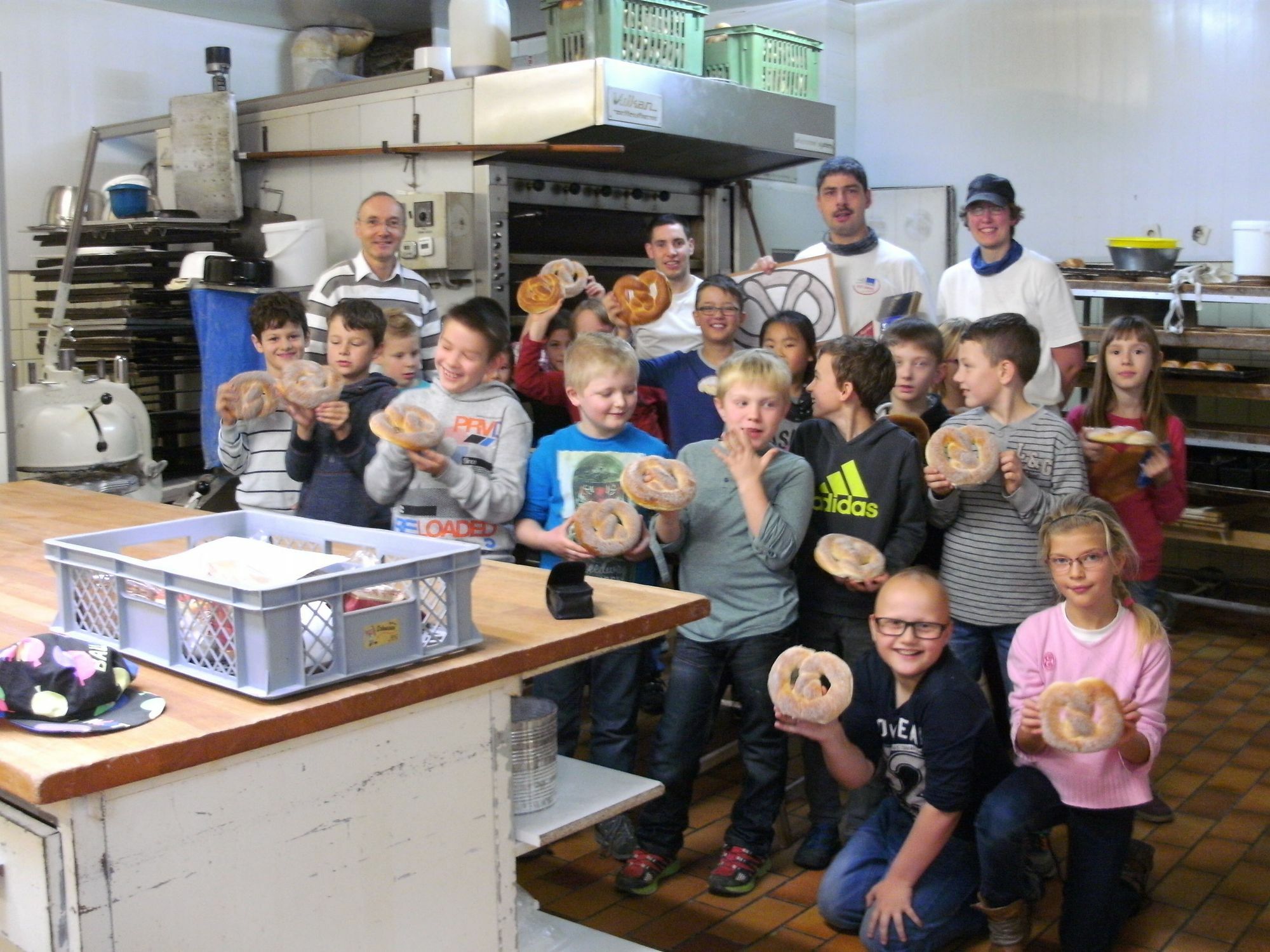 Im Unterricht hatten die Kinder die verschiedenen Getreidesorten, ihre Unterscheidung und Verwendung im Alltag behandelt. Im Klassenraum wurde in einer Kornmühle Getreide frisch gemahlen und ausgesiebt. Die Kinder lernten dabei Begriffe wie Vollkornmehl, Kleie, Schrot , Getreideflocken und die verschiedenen Typenbezeichnungen kennen. In der Backstube ging es dann praktisch zur Sache. Jedes Kind durfte seine eigene Brezel herstellen. Die Brezel wurden nach einer Garzeit im Garraum abgebacken und anschließend in der Backstube im Beisein von Bäckermeister und Gesellen genussvoll verspeist. Die noch warmen Knusperstangen, deren Herstellung die Kinder eindrucksvoll verfolgen konnten, schmeckten ebenfalls lecker. Im Verkaufsraum vor der Theke erfuhren die Kinder, welche Brotsorten im Sortiment angeboten werden. Dabei ging es auch um den jeweiligen Anteil der verschiedenen Mehlsorten, die Größe, das Gewicht, den Preis der einzelnen Brote und die Verwendung von Hefe und Sauerteig.