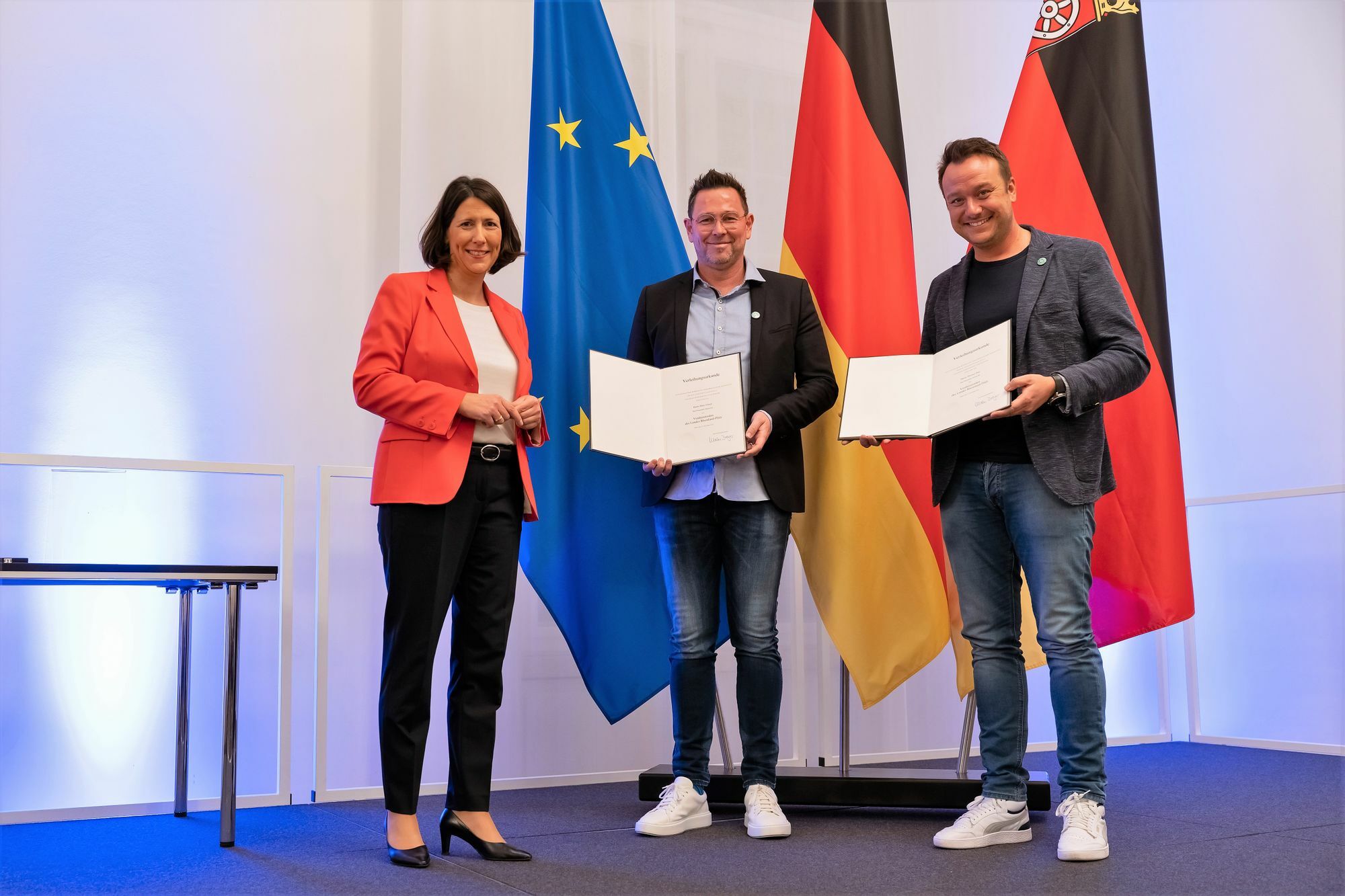 „Es macht mich stolz, auch in diesem Jahr Rheinland-Pfälzer und Rheinland-Pfälzerinnen auszuzeichnen, die sich in besonderer Weise um die Gemeinschaft verdient gemacht haben. Durch ihr Engagement haben sie dazu beigetragen, Menschen in Not zu helfen, unser Land weiterzuentwickeln und unsere Gesellschaft zu stärken – dieser Einsatz macht auch das Lebensgefühl und die Lebensqualität in Rheinland-Pfalz aus“, betonte Ministerpräsidentin Malu Dreyer anlässlich der 40. Verleihung des Landesverdienstordens. Den Orden erhalten seit 1982 jährlich Bürgerinnen und Bürger, die Außergewöhnliches für Rheinland-Pfalz geleistet haben. In Vertretung für die Ministerpräsidentin überreichte Wirtschaftsministerin Daniela Schmitt die Auszeichnung in der Staatskanzlei an zehn neue Ordensträgerinnen und Ordensträger. Sie hob hervor, welche herausragende Bedeutung dem ehrenamtlichen Engagement zukomme. „Insbesondere in den herausfordernden Zeiten während der Pandemie sowie in Folge der schrecklichen Flutkatastrophe sind Menschen eng zusammengerückt, haben sich gegenseitig unterstützt und Kraft gegeben. Auch in vielen anderen Bereichen leisten die Bürgerinnen und Bürger von Rheinland-Pfalz Großartiges. Sie unterstützen jene, die Hilfe benötigen. Sie engagieren sich und bringen tolle Projekte voran. Sie sind der soziale Kitt unserer Gesellschaft und Zukunftsgestalter. Die heute geehrten Landesverdienstordensträger stehen für das herausragende gesellschaftliche Engagement in unserer Gesellschaft. Dieses Handeln verdient unbedingt eine herausragende Würdigung und Anerkennung“, sagte Staatsministerin Daniela Schmitt. Von den Engagements der Ordensträgerinnen und Ordensträger zu lesen, habe sie tief beeindruckt. Der ehrenamtliche Einsatz mache sie sehr zuversichtlich, denn dieser Zusammenhalt sei es, der die Gesellschaft stärke. „Gerade, weil Ehrenamt oft im Hintergrund stattfindet, ist es uns wichtig, Ihr Engagement heute ins Rampenlicht zu stellen. Auch dazu soll diese Feierstunde Gelegenheit geben“, so Wirtschaftsministerin Daniela Schmitt. Der Landesverdienstorden ist die höchste Auszeichnung des Landes. Um diese Bedeutung hervorzuheben, ist die Zahl der Ordensträgerinnen und Ordensträger auf 800 begrenzt. Geehrt wurden auch Marc Ulrich und Thomas Pütz, aus Bad Neuenahr-Ahrweiler Unmittelbar nach der Flutkatastrophe erkannten beiden das logistische Problem bei der Koordinierung ehrenamtlicher und freiwilliger Hilfe und initiierten einen Shuttle-Service, der mittlerweile mehr als 180.000 Helferinnen und Helfer sicher und organisiert in die betroffenen Regionen gebracht hat. Sie entwickelten darüber hinaus die digitale Plattform #SolidAHRität, um Hilfsangebote zu erfassen und zu vermitteln. Ein weiteres erfolgreiches Projekt ist das Helfercamp auf dem Gelände des Innovationsparks Rheinland, an dem sich Helferinnen und Helfer versammeln und austauschen können. Mit der Gründung des Spenden-Shuttles, dem Marc Ulrich und Thomas Pütz gemeinsam vorstehen, haben sie erneut eine einzigartige Plattform geschaffen, die ihnen die gezielte Verteilung von Spendengeldern ermöglicht.