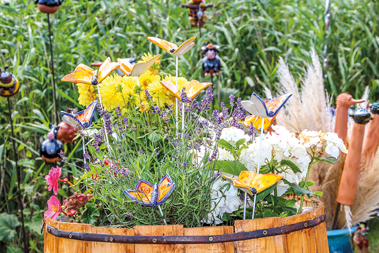 Auch der eigene Wellness-Bereich ist problemlos umsetzbar. Ob Infrarotkabinen oder Whirlpool, verschönert durch Möblierung mit einem Strandkorb kommt echtes Urlaubsgefühl im heimischen Garten auf. Floristik in Perfektion bietet Mehmet Yilmaz vom "Lersch Floral Design Store" aus Bad Neuenahr-Ahrweiler. Der kreative Florist, der zu den Top 5 Floristen der Welt gehört, beeindruckt mit ausgefallenen Kreationen aus Gewachsenem und edlem Kunsthandwerk aus Pflanzen, Blumen und Blättern. Dauerhafte Kunst zeigt Metallkünstler Norbert Ording aus Halen. Er verwandelt Paneele aus Edelrost in individuelle Namensschilder, Hinweisgeber und vieles mehr. Die Wunschmotive schneidet er frei Hand mittels funkensprühendem Plasmaschnitt in die Eisenplatten.