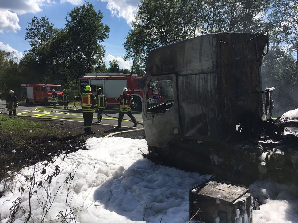 Bei einem LKW-Brand zwischen Barweiler und Wiesemscheid waren die Feuerwehren Adenau, Antweiler, Barweiler, Meuspath, Nürburg und Pomster im Einsatz. Die Zugmaschine war in Brand geraten und wurde mit Schaummittel unter Atemschutz abgelöscht. Um 15.28 Uhr wurden zunächst die Feuerwehren Barweiler, Meuspath, Nürburg und Pomster, sowie die Feuerwehreinsatzzentrale alarmiert. Diese alarmierte, direkt nachdem sie besetzt wurde, die Feuerwehr Adenau nach. Kurze Zeit später erfolgte auf Anforderung des Einsatzleiters vor Ort die Nachalarmierung der Feuerwehr Antweiler. Insgesamt waren 38 Einsatzkräfte mit acht Fahrzeugen, davon vier Tanklöschfahrzeuge, im Einsatz. Um den Brand löschen zu können wurden drei Trupps unter Atemschutz eingesetzt. Ein angrenzender Wald drohte zwischenzeitlich ebenfalls in Brand zu geraten und wurde durch eine Riegelstellung geschützt. Die Bundesstraße 258 wurde während des Einsatzes durch die Unterstützung der Polizei aus Adenau voll gesperrt. Zur Eigensicherung der Einsatzkräfte war der Rettungswagen Kelberg vor Ort.