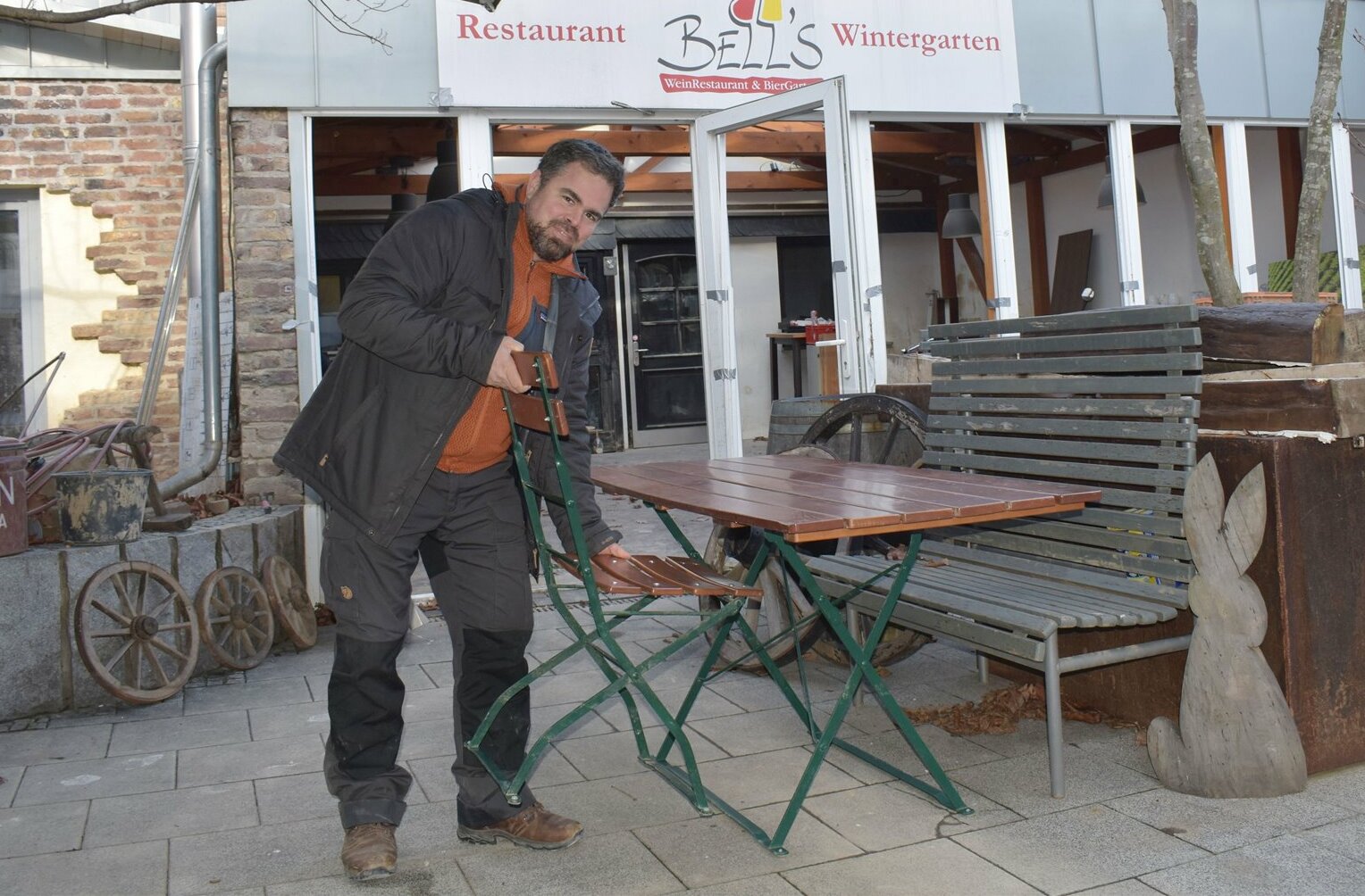 Noch stellt Markus Bell im Biergarten das alte Mobiliar auf. Zur Eröffnung soll der Biergarten in »Bells WerkStadt« aber auch mit neuen Tischen und Stühlen aufwarten.