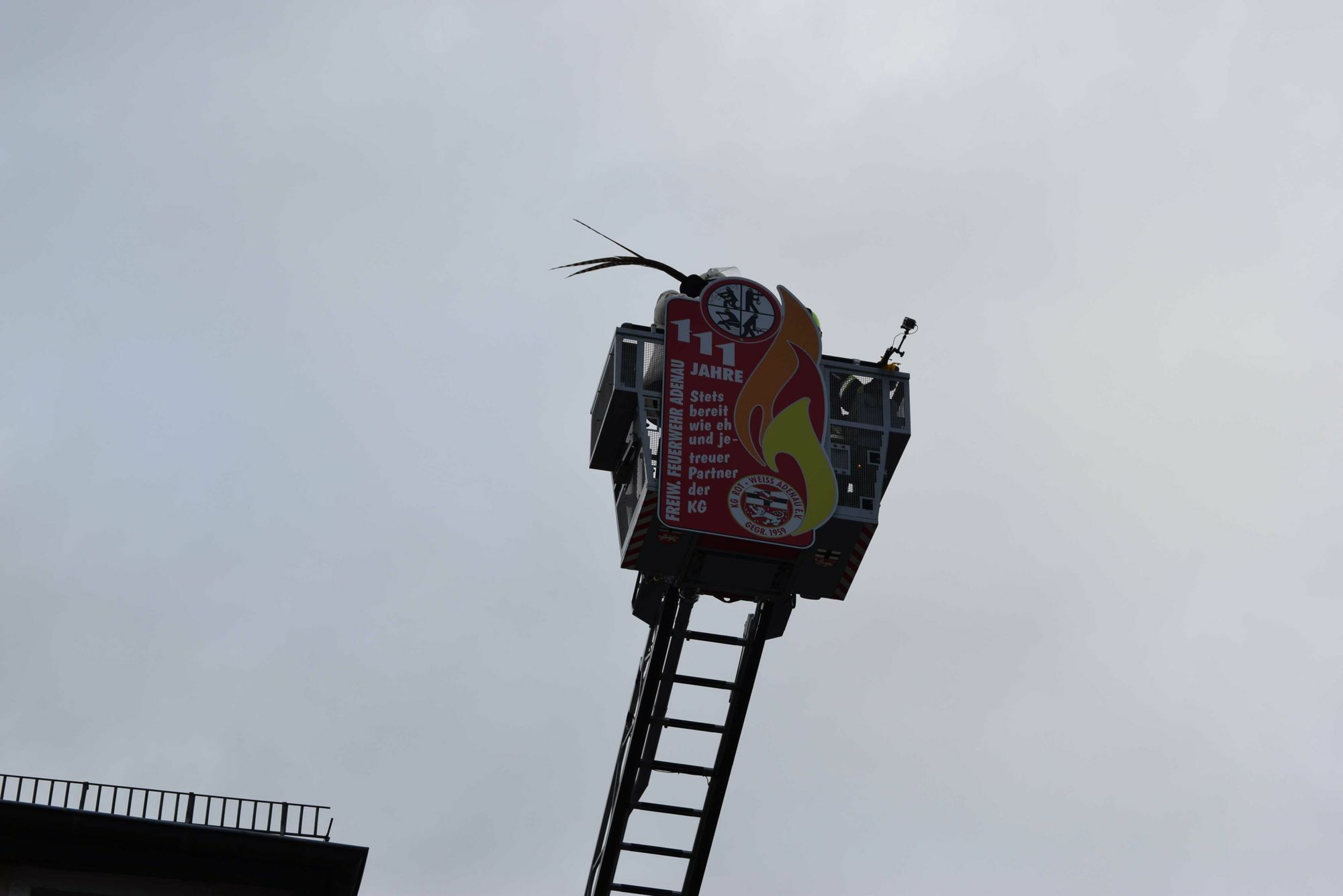 Unter dem Sessionsmotto "Freiwillige Feuerwehr 111 Jahre - stets bereit wie eh und je, treuer Partner der KG" feiern die Adenauer Narren die Session 2018/19. Damit ehrt die KG die Floriansjünger, ohne deren Hilfe und Engagement kein Karnevalsumzug denkbar wäre. Stilecht enthüllte KG-Präsident Christoph Böder das Sessionsmotto von der Feuerwehr-Drehleiter, hoch über den Köpfen der feiernden Narren. Neben einem karnevalistischen Programm mit kurzen Redebeiträgen und Musik stand außerdem ein Personalwechsel an. Sitzungspräsident Thomas Sebastian übergab sein Amt nach elf Jahren an seinen Nachfolger Herbert Radermacher. Noch während auf dem Marktplatz gefeiert wurde, öffneten die Adenauer Geschäfte zum verkaufsoffenen Sonntag und luden zum sonntäglichen Einkaufsbummel ein. Ein Krammarkt und eine Autoschau in der sonst autofreien Innenstadt, ergänzten das Angebot.