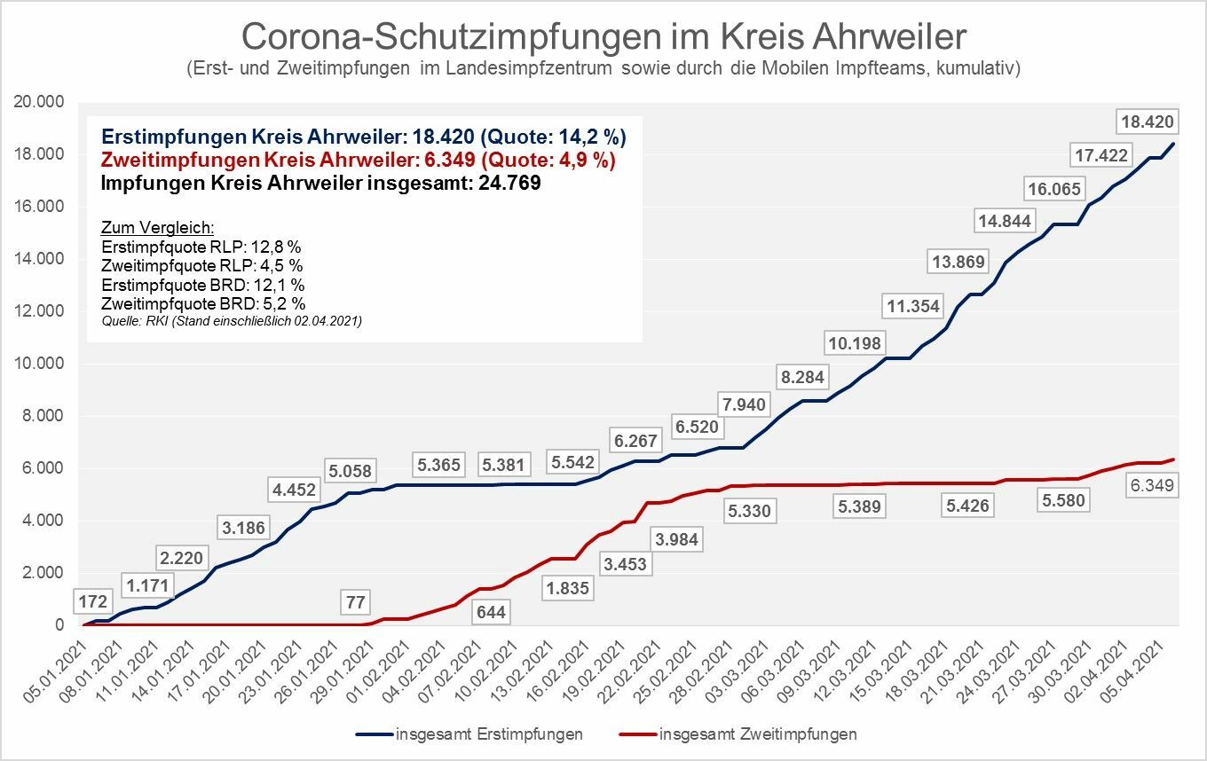 Mehr als 3700 Impfungen sind in den vergangenen acht Tagen, 29. März bis einschließlich 5. April, im Landesimpfzentrum in Grafschaft-Gelsdorf als auch von den mobilen Impfteams des DRK durchgeführt worden – davon 3100 Erst- sowie 600 Zweitimpfungen. Seit dem Start der Corona-Schutzimpfungen im Kreis vor drei Monaten wurden mehr als 24.700 Impfungen (rund 18.400 Erst- und 6300 Zweitimpfungen) vorgenommen. Der Kreis liegt damit bei einer Impfquote von 14,2 Prozent der Erst- und 4,9 Prozent der Zweitimpfungen.