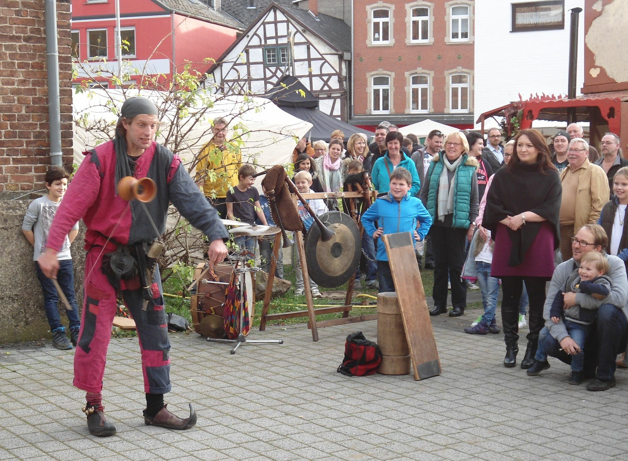 Auf große Resonanz stieß der Adenauer Martinsmarkt im historischen Zentrum des Eifelstädtchens. Was samstags mit dem Martinszug und den mittelalterlichen Einlagen und Ständen begonnen hatte, setzte sich sonntags bei freundlicher Witterung bemerkenswert fort. Zahlreiche Gäste nutzten den verkaufsoffenen Sonntag zu einem entspannten Einkaufsbummel. Wie immer hatte sich die Hauptstraße in eine riesige Fußgängerzone verwandelt, während sich um die Pfarrkirche Gaukler, Rittersleut und Marktschreier in Gewänder gehüllt und mit ihren Ständen gruppiert hatten. Die Vorführungen waren wahre Publikumsmagnete. Riesige Menschentrauben bildeten sich um die Protagonisten, zu denen unter anderem Kasper der Gaukler gehörte. Auch die Musiker von Heidenlärm begeisterten ebenso wie Luna auf ihren Stelzen. Immer wieder brandete Applaus auf, den sich die aktuelle Ausgabe des Martinsmartes in Adenau auch redlich verdient hatte.
