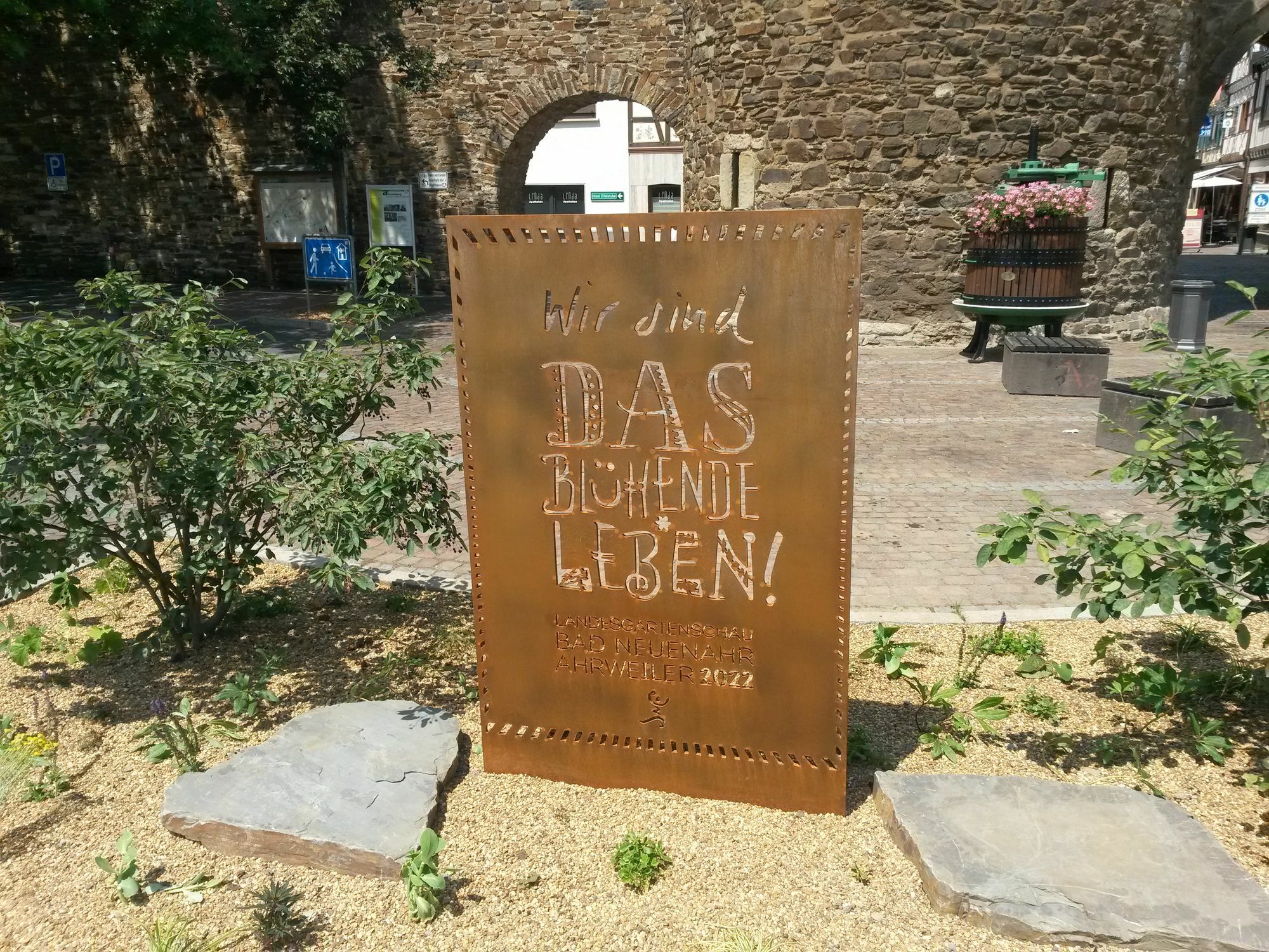 Unter dem Motto „Das Blühende Leben“ hatte die Stadt im Vorjahr ihre Bewerbung auf den Weg gebracht und im September 2016 auch den Zuschlag erhalten. Dieser Leitspruch soll auch an den neuen Stelen zum Ausdruck kommen. „An beiden Standorten wurden die die Stelen umgebenden Beete ebenfalls neugestaltet, die so Petrus will, bald mit ihrer Blütenpracht bereits heute zur Landesgartenschau 2022 in Bad Neuenahr-Ahrweiler einladen wollen.“, sagt Jens Heckenbach, städtischer Geschäftsführer der Landesgartenschau Bad Neuenahr-Ahrweiler 2022 gGmbH. „Wir wollen mit den Stelen in den beiden namensgebenden Stadtteilen zugleich ein Zeichen für das Miteinander setzen“, sagte Bürgermeister Guido Orthen, „denn die Landesgartenschau ist ein Projekt der gesamten Stadt.“