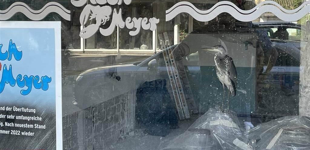 Diese stellten im flutgeschädigten Erdgeschoss des Quellenhofes einen eingeschlossenen Fischreiher fest, dem es augenscheinlich nicht gelang, sich selbst aus seiner Lage zu retten. Wie der Reiher in die nicht frei zugängliche und in der Renovierung befindliche Baustelle gelangen konnte, war nicht zu ermitteln. Eventuell hatte sich das Tier in den ehemaligen Räumlichkeiten eines Fischhandels ein günstiges Mittagsmahl erhofft. Nun war der Reiher in der Baustelle gefangen und hatte keinerlei Aussicht auf seine Leibspeise. Es gelang schließlich, den Inhaber der Immobilie zu erreichen, der den Zutritt ins Objekt ermöglichen konnte. Mit vereinten Kräften und viel "Reihergeflüster" konnte das Tier aus seiner misslichen Lage befreit werden.